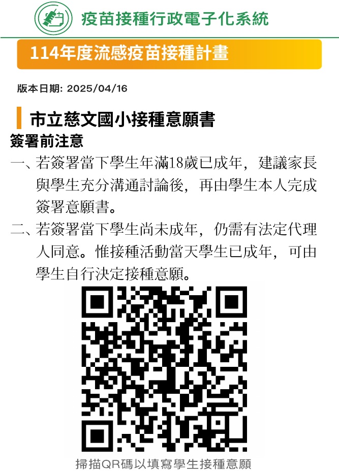 6.不論是否有意願在校接種流感疫苗,皆須完成線上簽署!若您不方便使用QR code線上簽署,請主動告知導師聯絡健康中心協助處理,感謝您的配合!