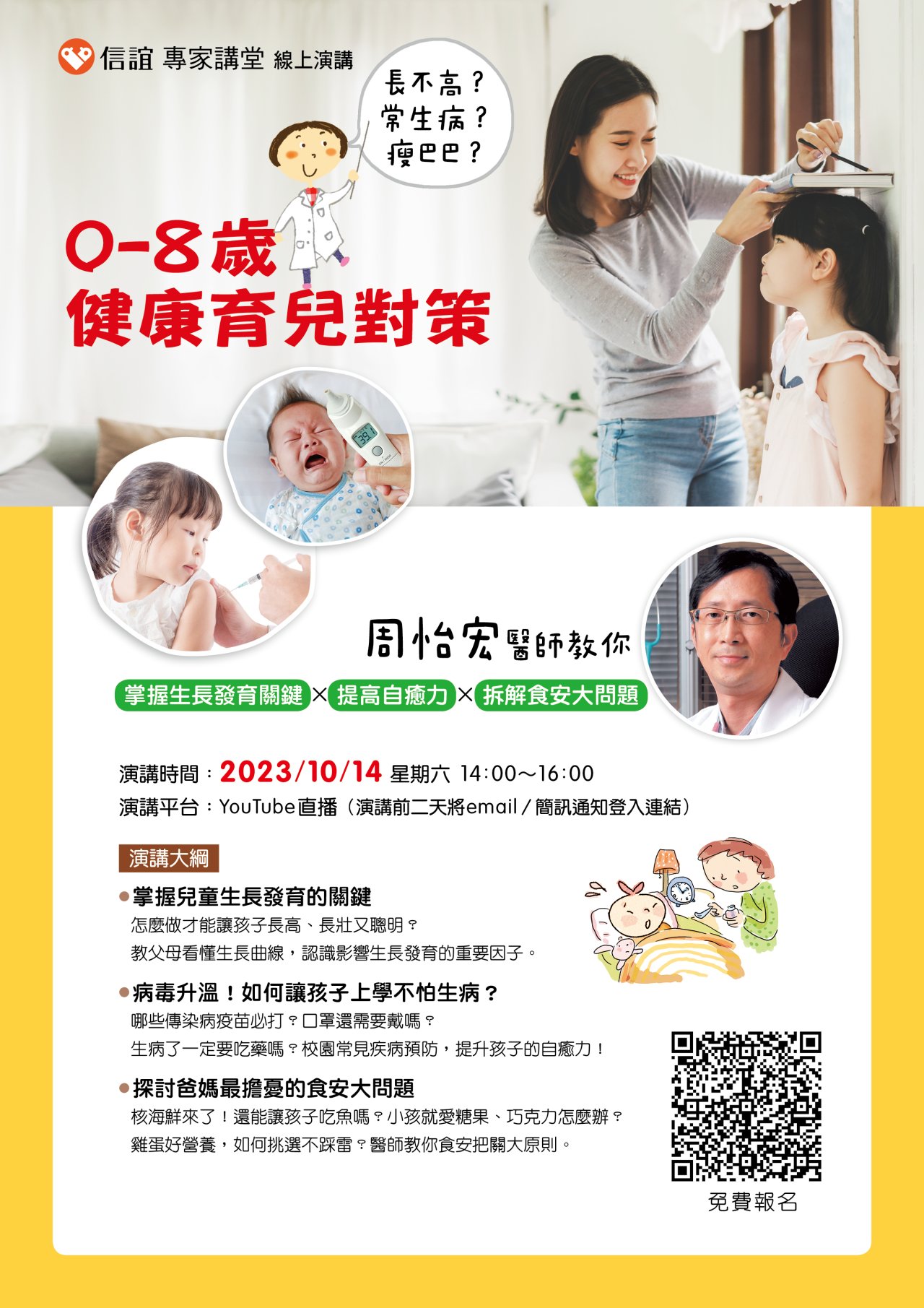 一、 孩子平安與健康是父母與老師的最大心願。但是,孩子入學後經常生病,我們該如何預防並提高自癒力?秋冬正值各種病毒蔓延,【信誼專家講堂】特別邀請小兒醫學專家~周怡宏醫師進行專題演講,周醫師將以30年的醫學知識與臨床經驗,傳授父母健康育兒的對策。。