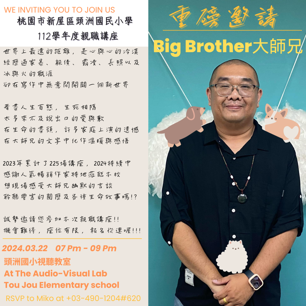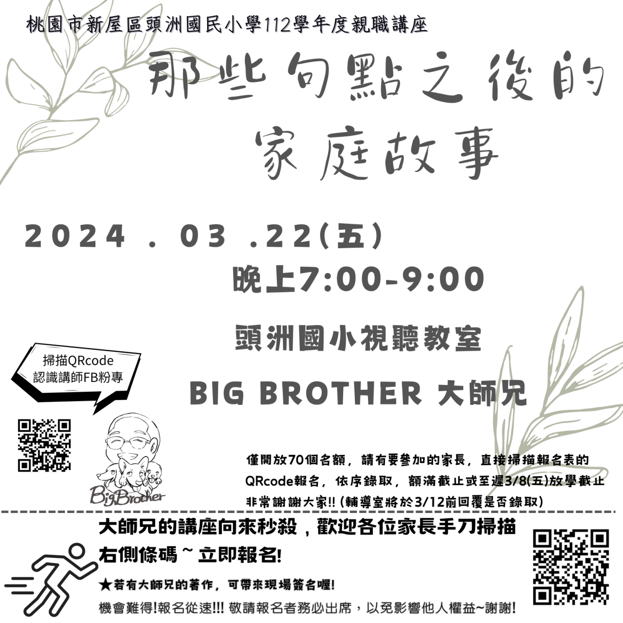 二、 本活動相關訊息如下: (一)時間:113年03月22日(五)晚上17:00-19:00 (二)地點:本校視聽教室 (三)講師:大師兄 老師 (四)主題:那些句點之後的家庭故事