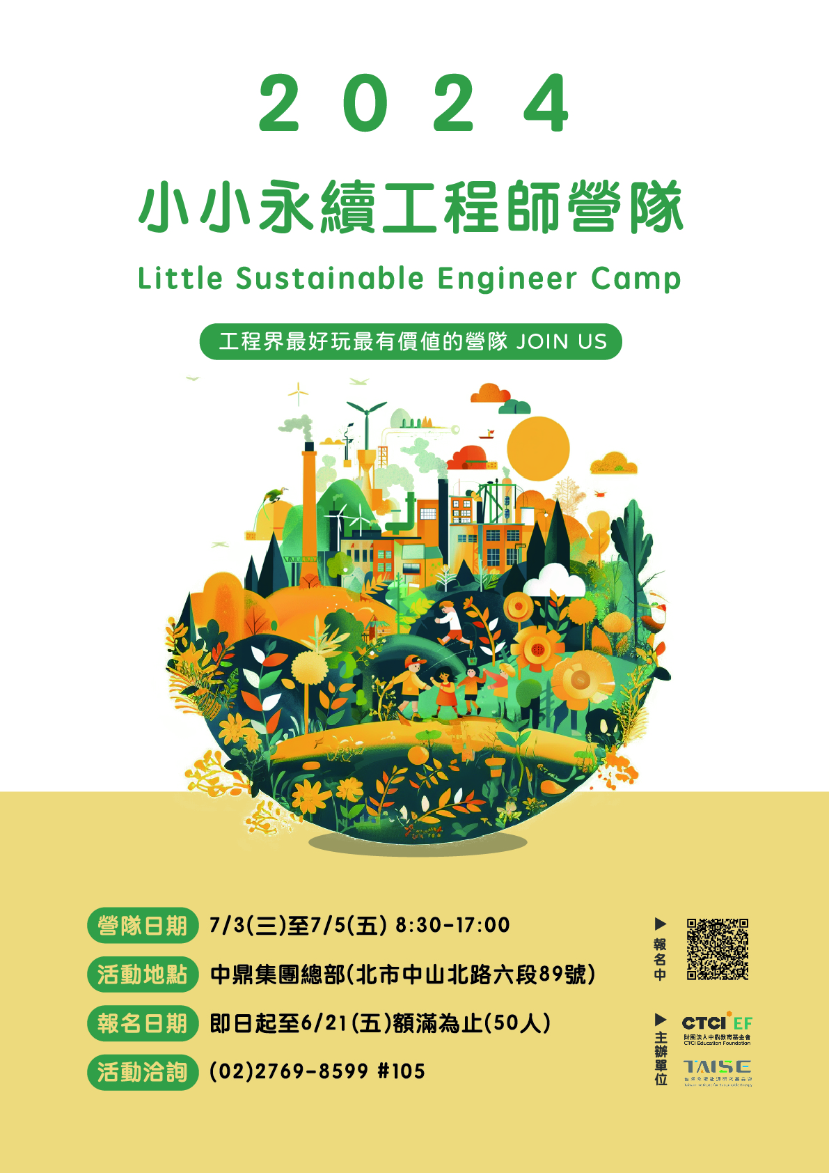 一、 聯合國永續發展目標(SDGs)已是全球政府、教育、企業領域的共通語言,永續發展教育(ESD)與永續發展目標之整合運用係全球最新趨勢。本會主辦「2024小小永續工程師營隊」期能提升國小學童在環境永續、工程領域相關的專業知能,培養其創造力與自主學習力。