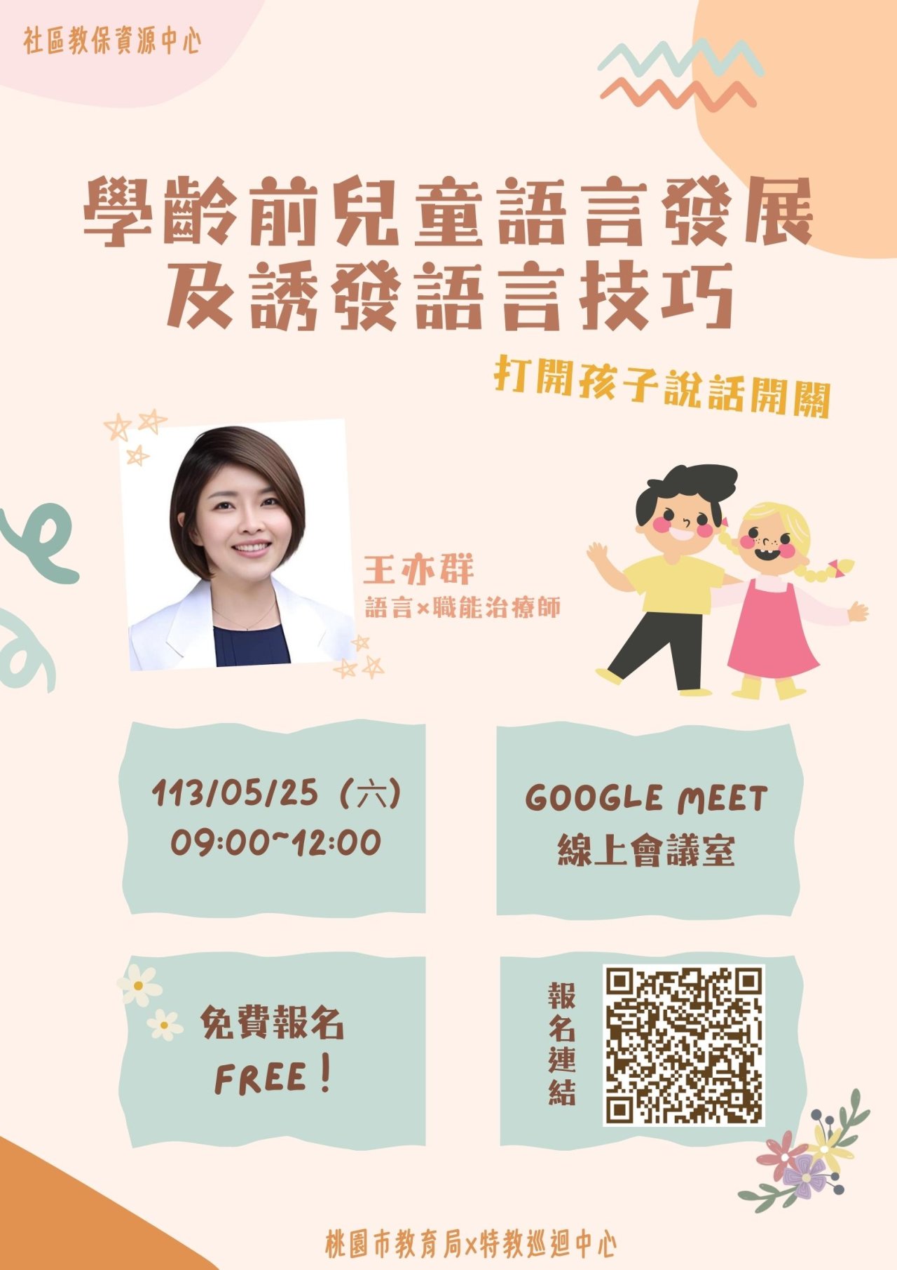(一)採自由報名,可至本市特殊教育學生巡迴教育資源中心網站(https://itinerant.special.tyc.edu.tw/)-最新消息-113/05/25社區教保中心線上講座:【學齡前兒童語言發展及誘發語言技巧】-報名預約。
