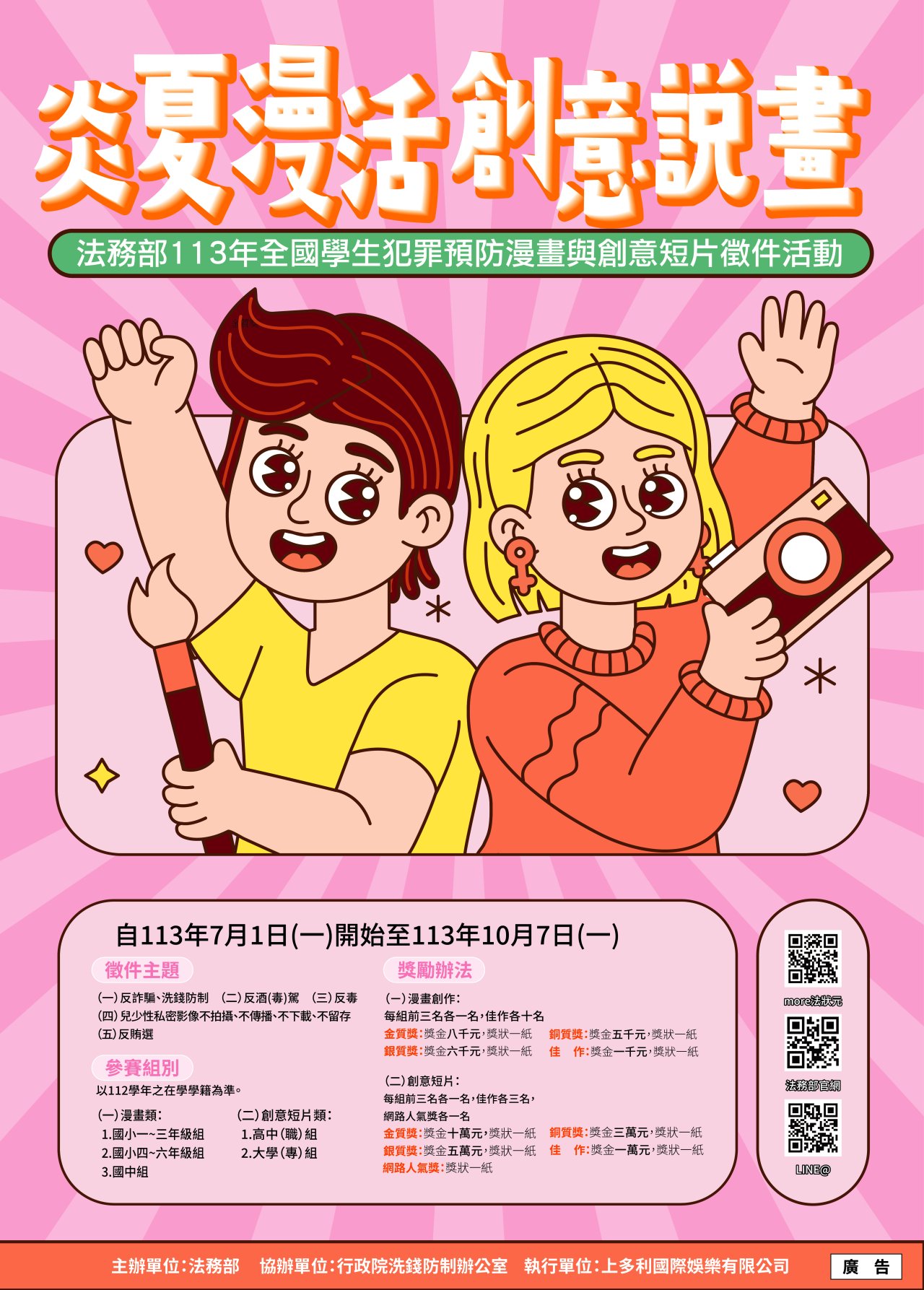 壹、主旨:法務部辦理之「炎夏『漫』活,創意說『畫』」113 年全國學生犯罪預防漫畫與創意短片徵件活動。