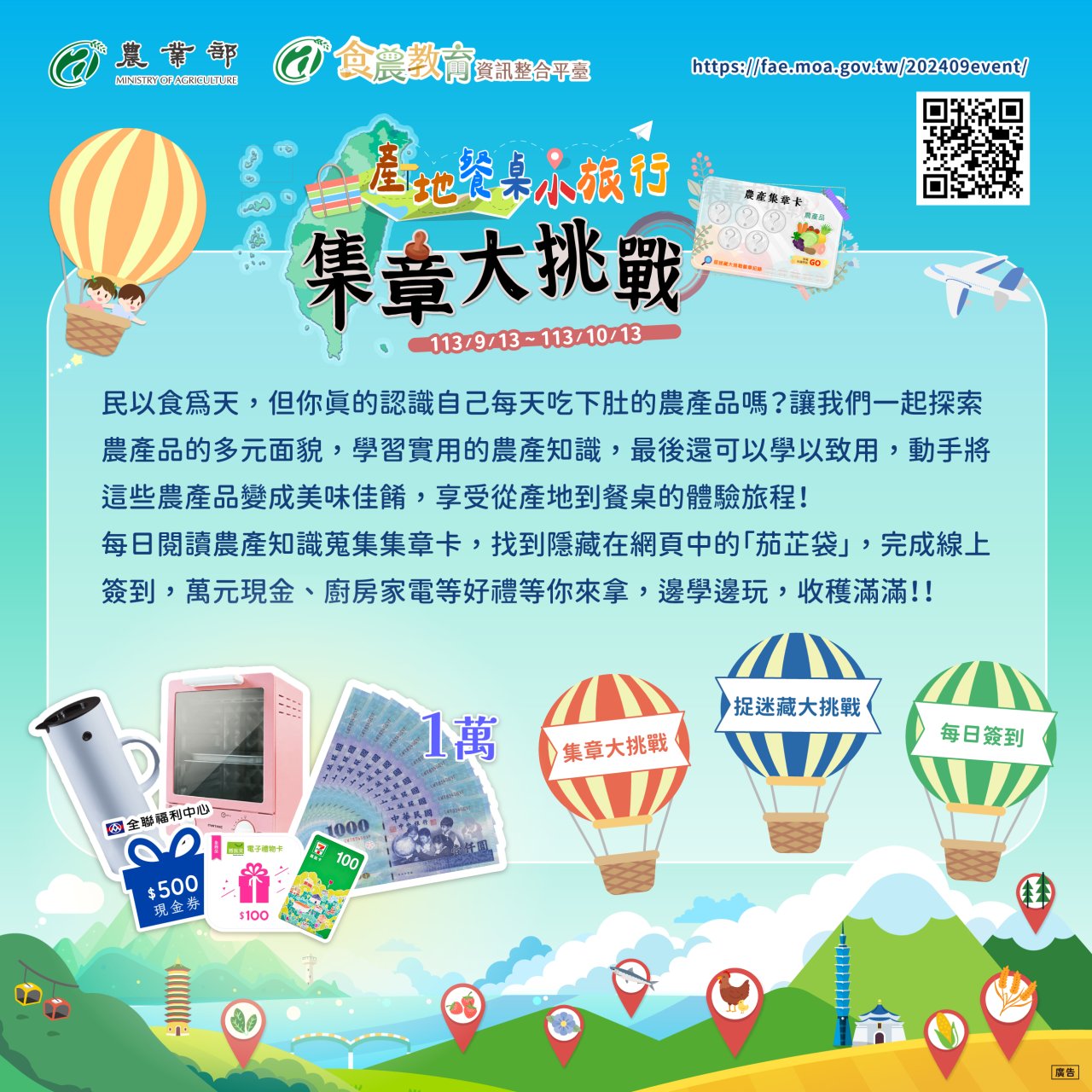 | 四、 | 為使大眾更加瞭解食農教育並探索在地農產,預訂於113年9月13日至10月13日舉辦「產地到餐桌小旅行 集章大挑戰」食農教育推廣活動(https://fae.moa.gov.tw/202409event/),提供食農教育相關知識集章挑戰、網頁捉迷藏、簽到打卡等遊戲,參與活動即可抽獎,包含萬元現金、廚房家電、禮券等多項好禮,歡迎踴躍參與。 |