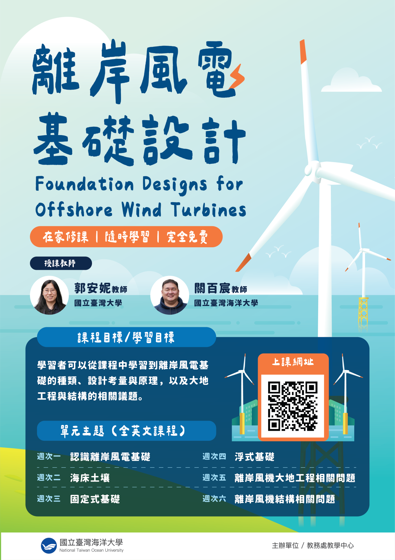 | (二) | 課程內容:課程涵蓋離岸風電基礎理論、海床土壤特性、固定式與浮式基礎設計,以及離岸風機大地工程及結構相關問題。 |