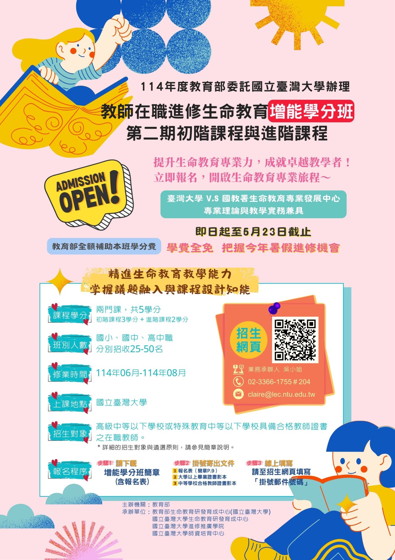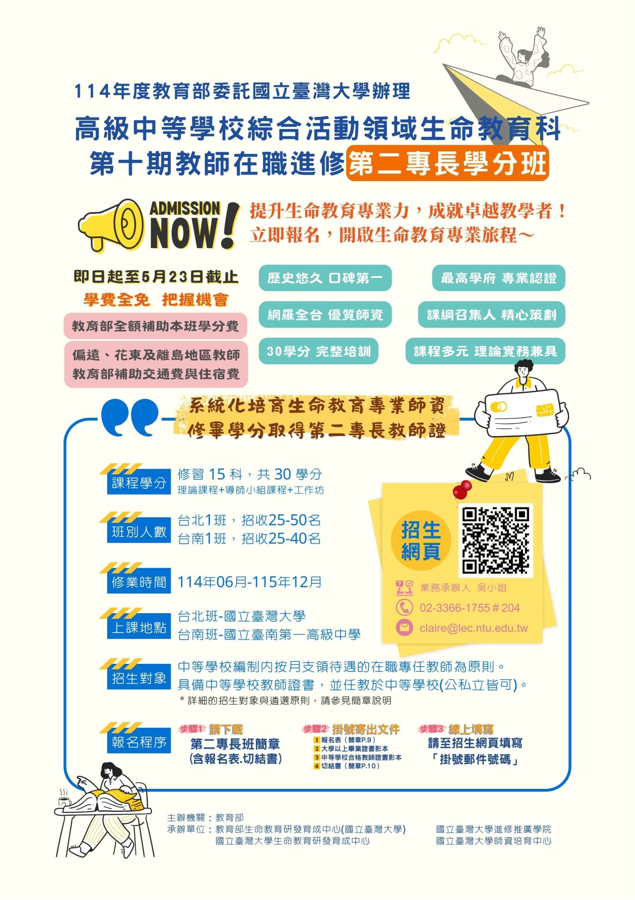 一、 為落實十二年國民基本教育課綱精神,精進中小學教師生命教育專業知能,教育部委請國立臺灣大學辦理「高級中等學校綜合活動領域生命教育科教師在職進修第二專長學分班」及「教師在職進修生命教育增能學分班」,學分費皆由教育部全額補助。