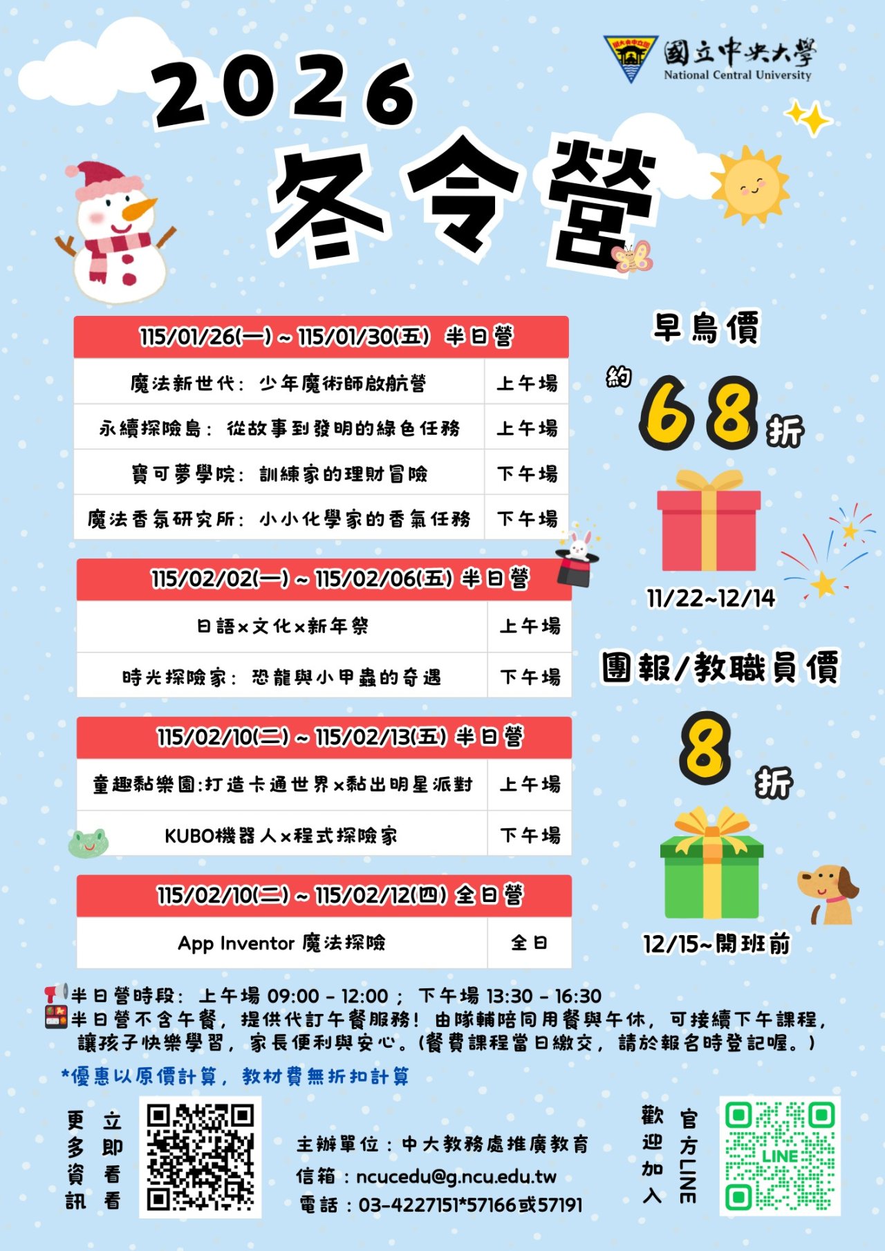 一、 為豐富國小學童之寒假活動,並提供多元優質學習內容,本校推出「2026 冬令營」,課程涵蓋科學、程式、藝文、永續、語言文化等主題,結合情境任務與創意實作,期能帶領學童在寒假期間持續探索學習的樂趣,提升多元能力與素養。