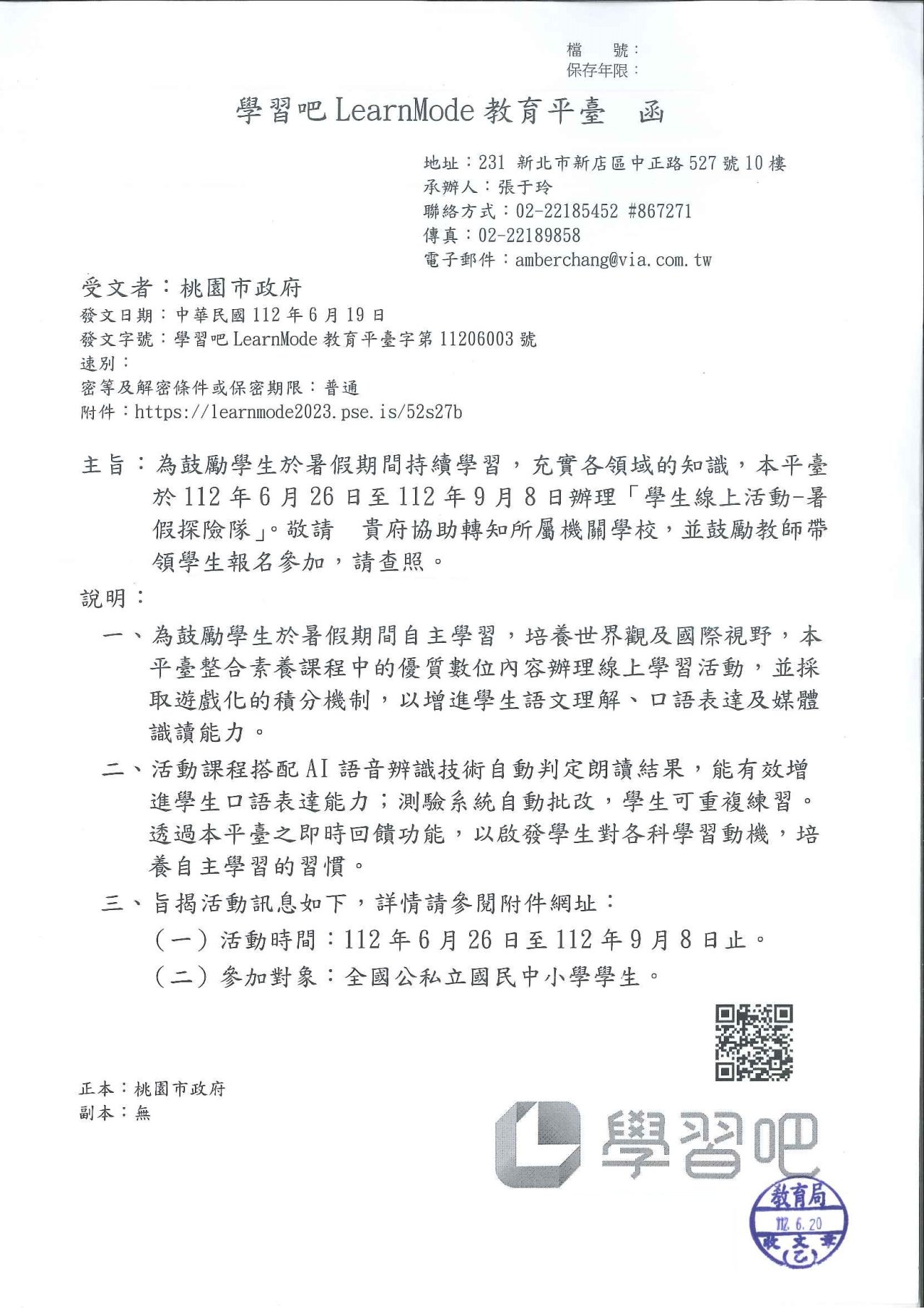 | 一、 | 依據學習吧 LearnMode 教育平臺112年6月19日學習吧 LearnMode 教育平臺字第11206003號函辦理。 |