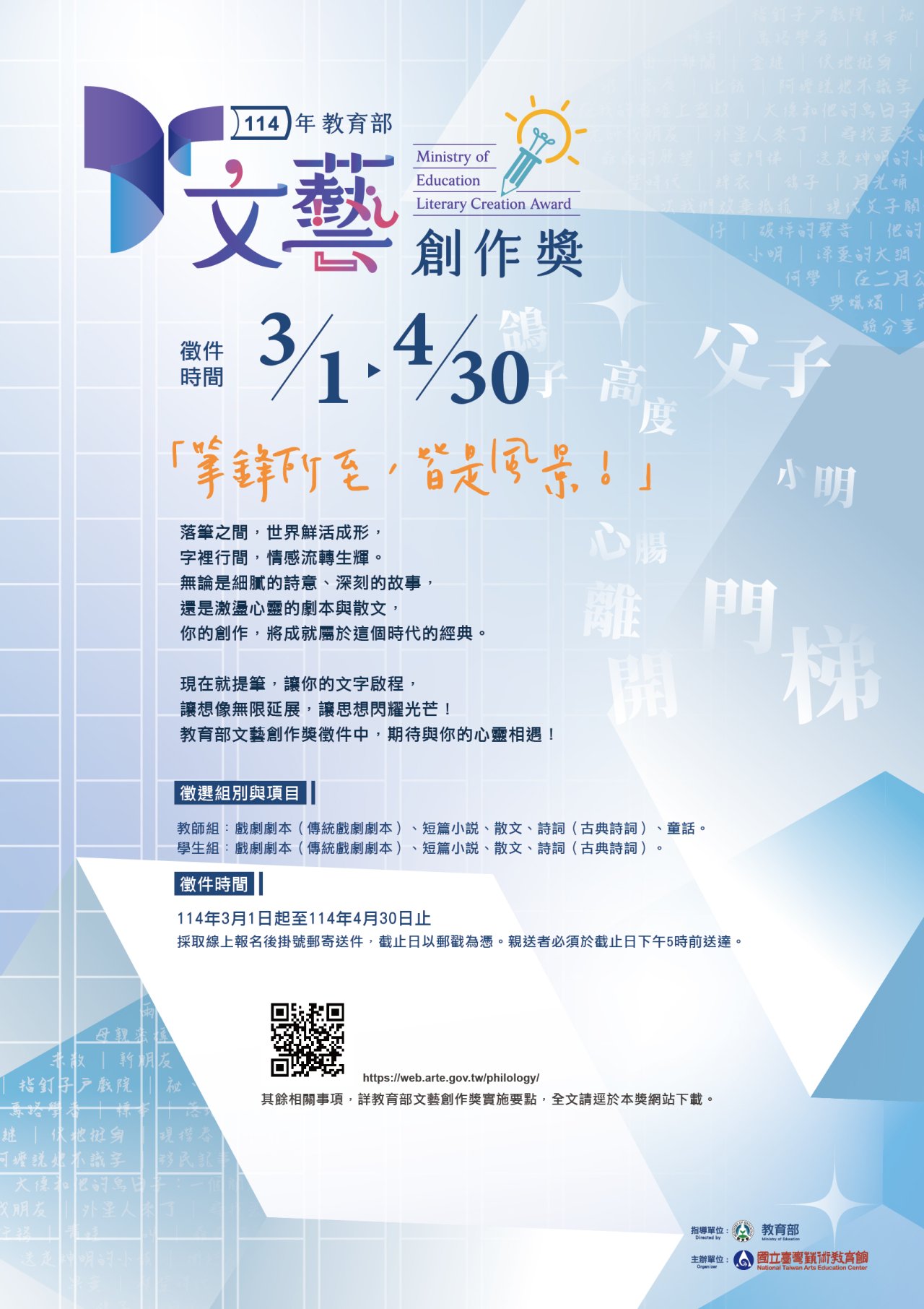轉知國立臺灣藝術教育館辦理114年教育部文藝創作獎一案,詳如說明: