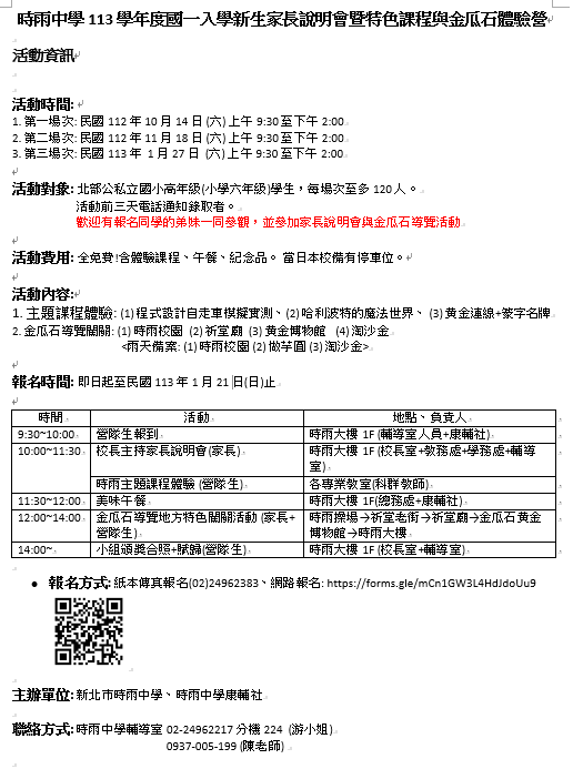 | 四、 | 活動地點:新北市私立時雨中學、新北市立黃金博物園區 |