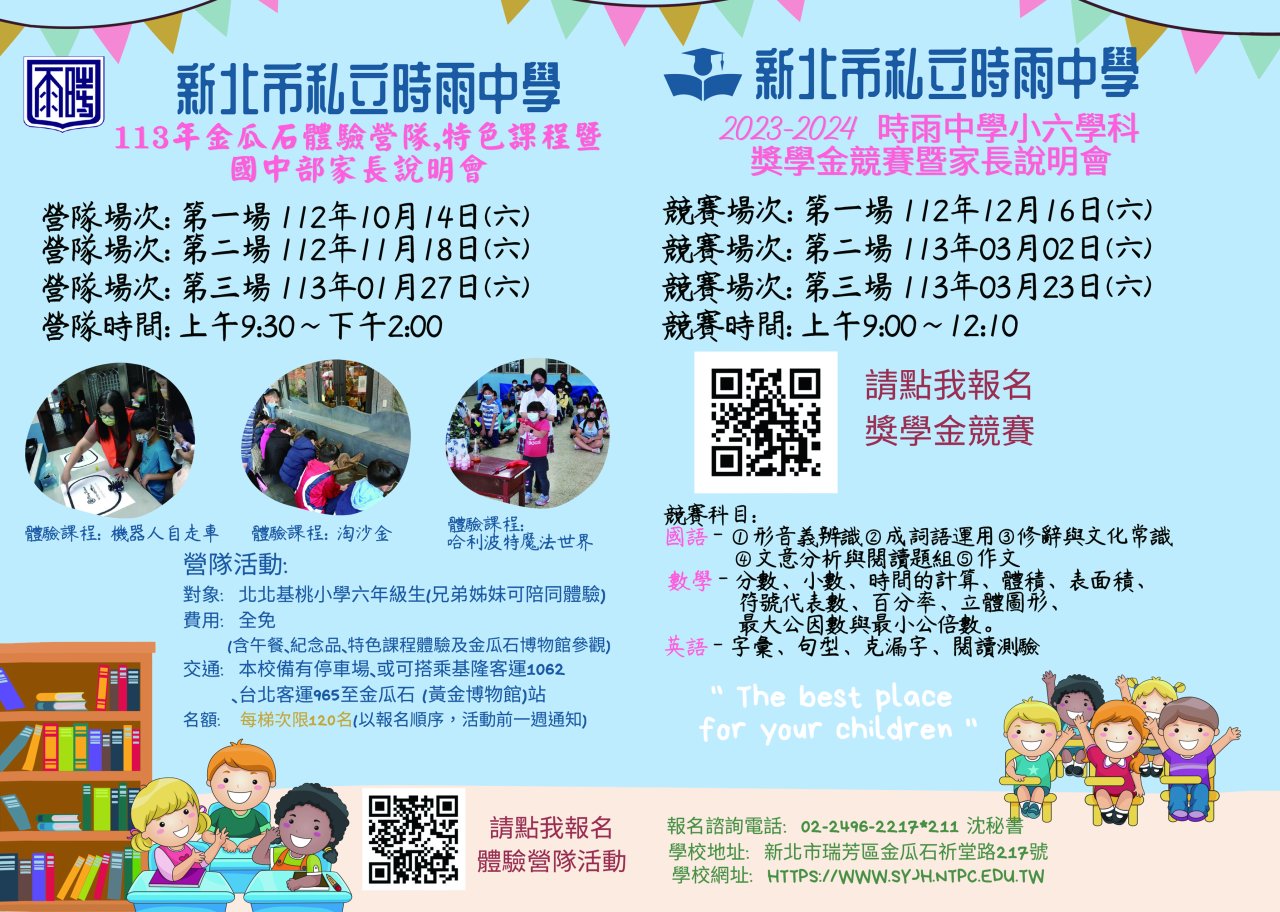 | 一、 | 活動目的:因時雨中學獨特人文地理學習環境,故辦理此體驗營活動,提供小學生深度探索金瓜石歷史地理之機會,進而培育人文素養,在潛移默化的人文薰陶中,踏察優良的學習環境與氛圍。 |
