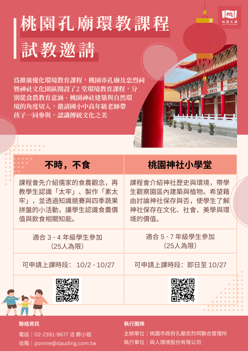 | (二) | 【桃園神社小學堂】課程試教報名表:https://forms.gle/nbN1YngoYnY6KmyW6 |