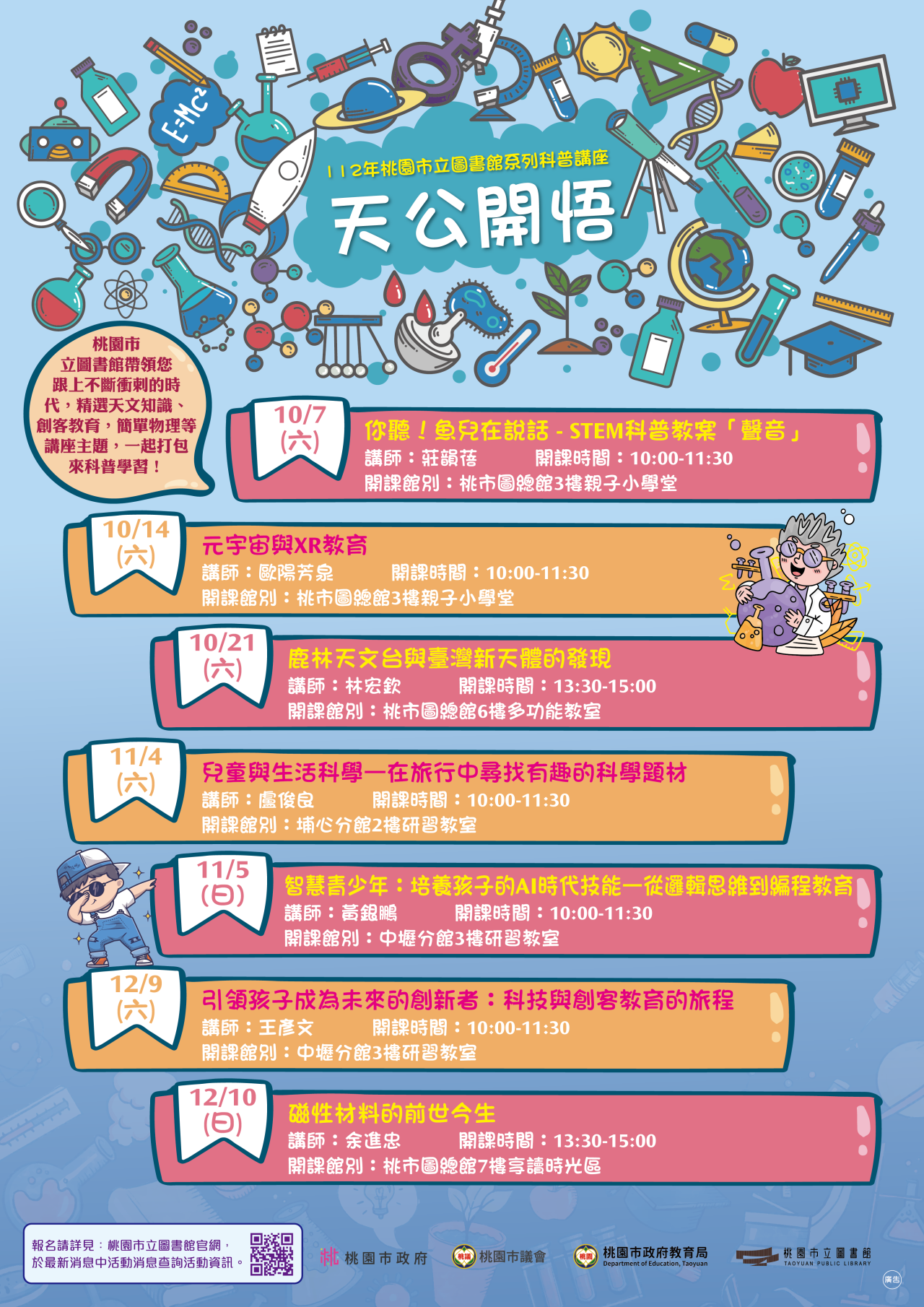 桃園市立圖書館辦理「【天公開悟】112年桃園市立圖書館系列科普講座」,鼓勵同仁、學生與民眾踴躍參加,說明如下: