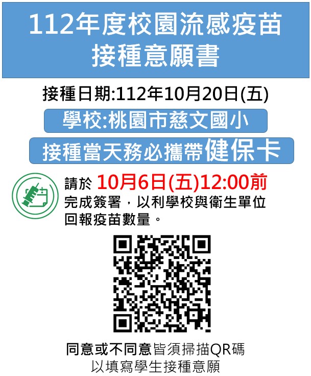2.不論您是否有意願在校接種流感疫苗,皆須完成線上簽署作業,系統設定時間截止後則無法再填報;於期限截止前,您都能透過手機掃描QR code重新填寫意願,系統將依最新結果為準。