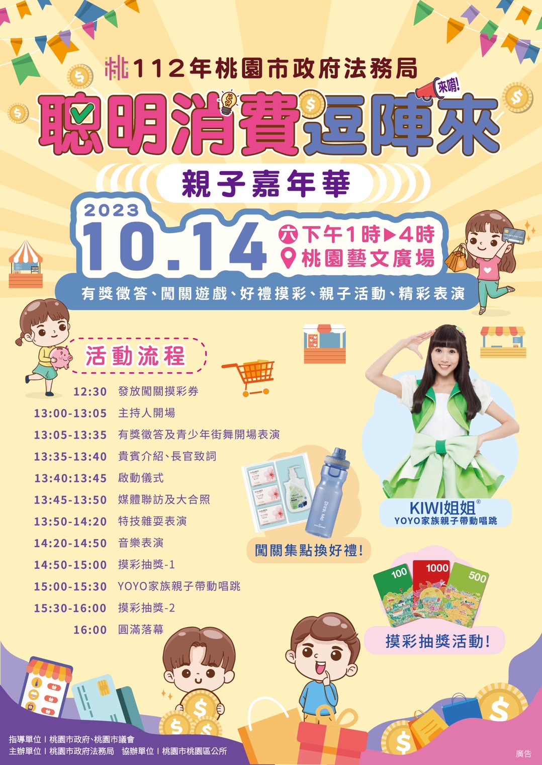 二、本府法務局將於112年10月14日(星期六)下午1時至4時在桃 園區藝文廣場辦理旨揭活動,內容精彩豐富,詳情請上桃園市政府法務局網站(首頁>訊息公告>最新消息>112年聰明消費逗陣來親子嘉年華活動)查詢。