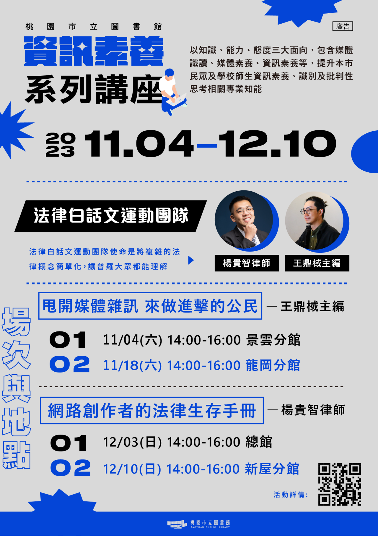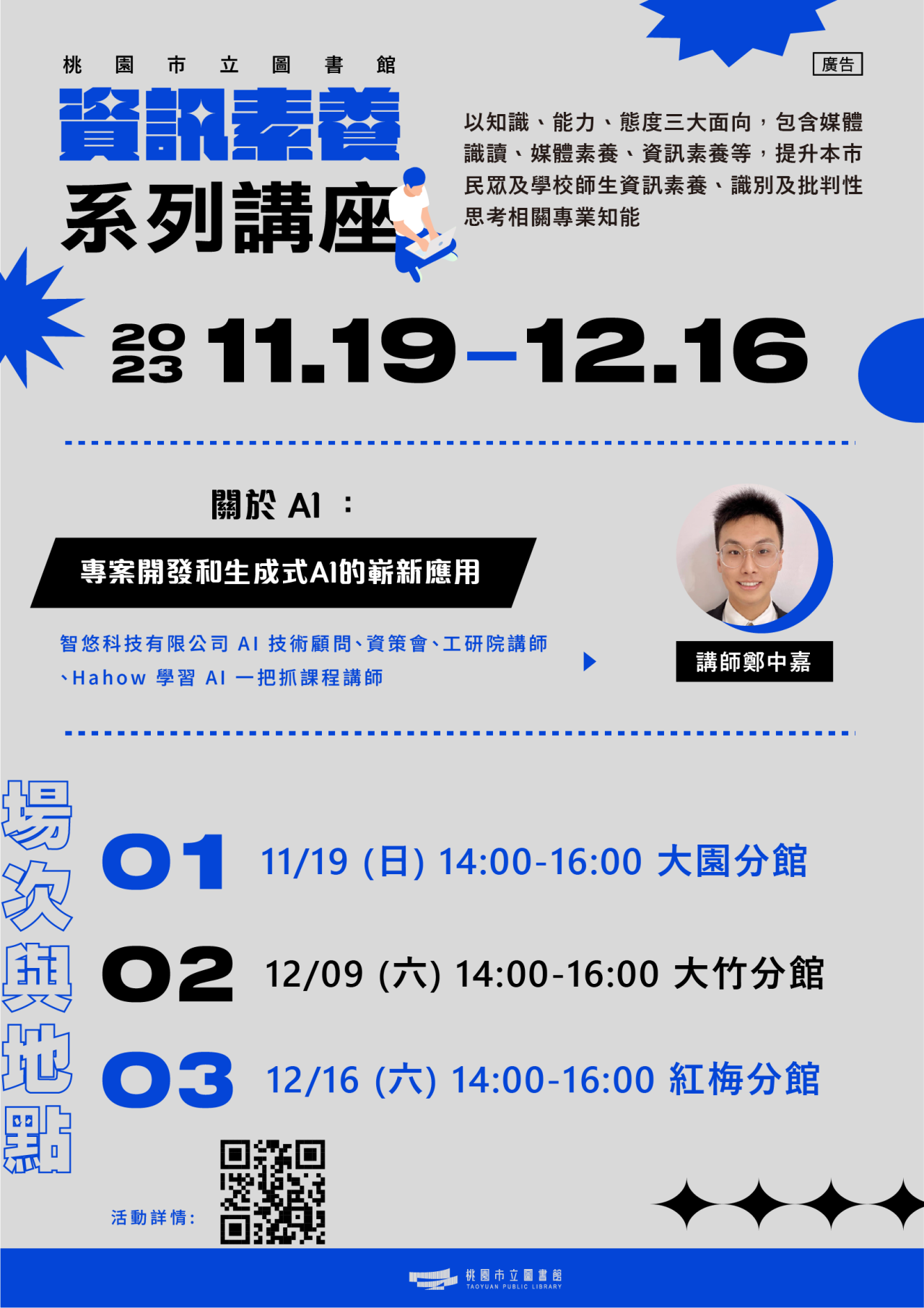 桃園市立圖書館辦理「2023資訊素養系列講座」海報電子檔,鼓勵同仁、學生與民眾踴躍參加,說明如下: