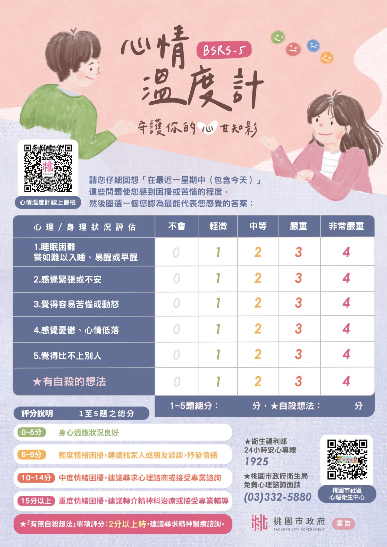 一、 施測結果可供教師或民眾瞭解自己近期的身心狀況,適時運用心理衛生資源及求助專業協助達轉介標準者(總分15 分以上或有自殺想法分數2分以上),後續將由本府衛生局致電關懷,評估是否持續追蹤或轉介相關單位。