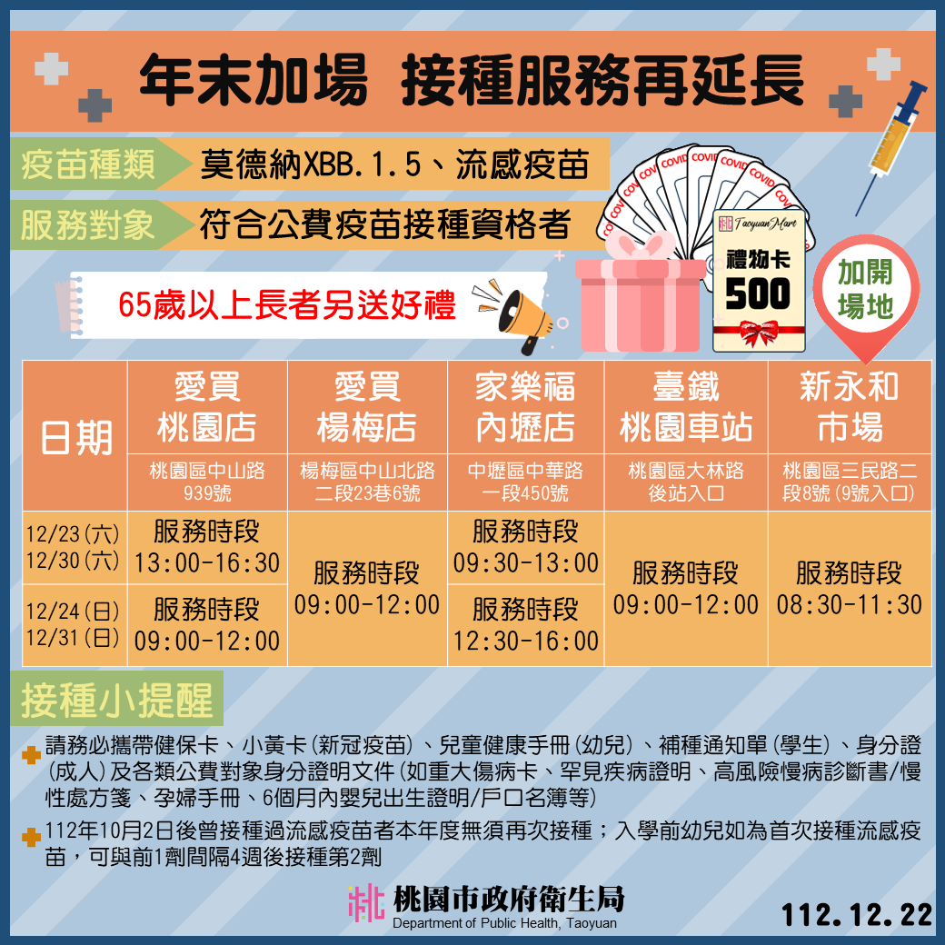 桃園市政府衛生局於112年12月30日及31日假桃園愛買、楊梅愛買、內壢家樂福、新永和市場及臺鐵桃園站均有開設莫德納XBB.1.5疫苗及流感疫苗接種站(如附件),鼓勵學生、家長及教職員工多加運用,儘速完成疫苗接種。