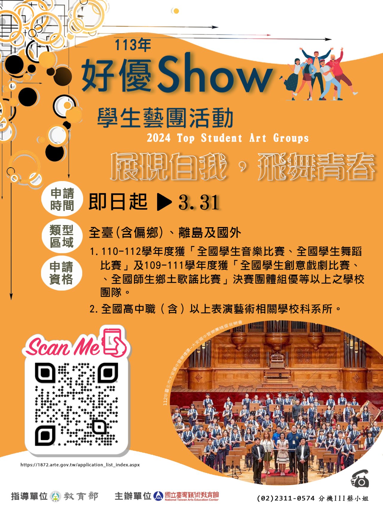 壹、主旨:國立臺灣藝術教育館「113年好優Show學生藝團活 動」徵選計畫書暨相關書表,歡迎踴躍報名參選。