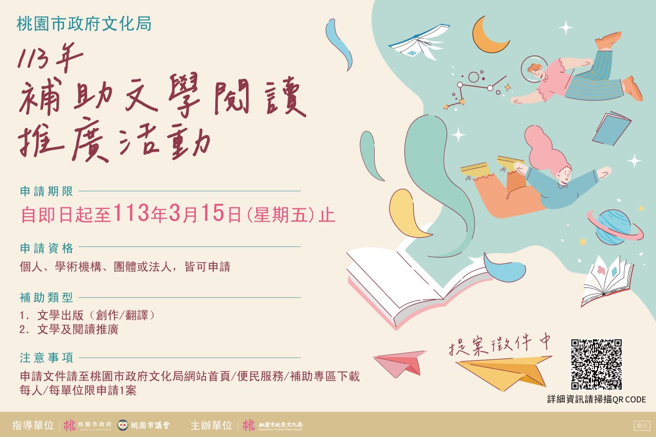 「113年補助文學閱讀推廣活動實施計畫」自即日起至113年3月15日受理補助申請,請惠予轉知所屬、相關團體或個人踴躍申請並公告周知,說明如下: