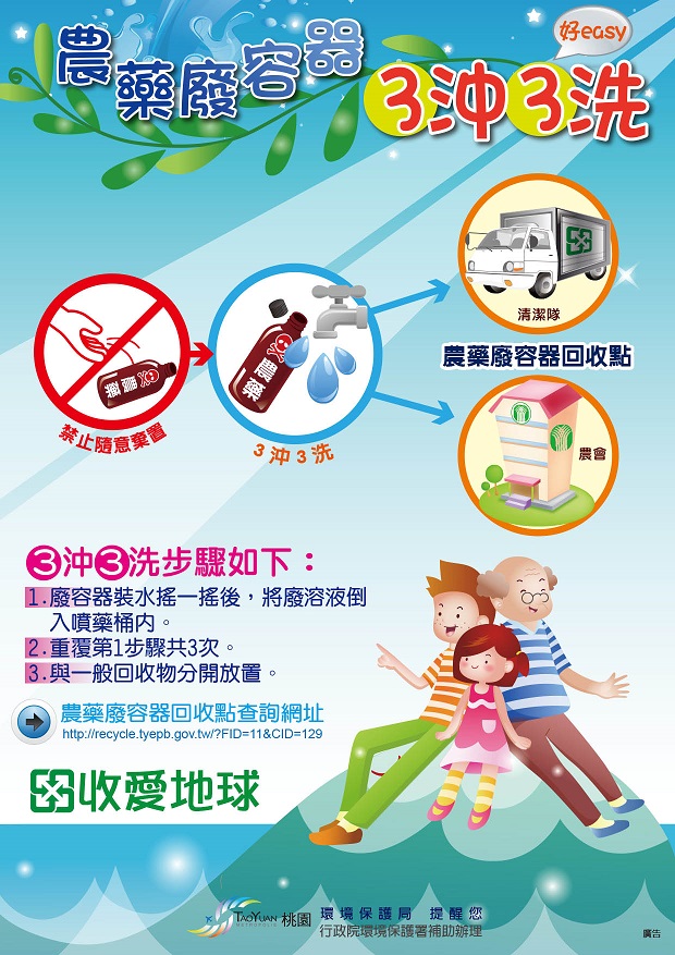 處理程序:請用水灌入農藥瓶子搖一搖搖均勻後,將水倒入噴藥桶中(重複清洗3次),再將此農藥瓶子和一般回收分開回收