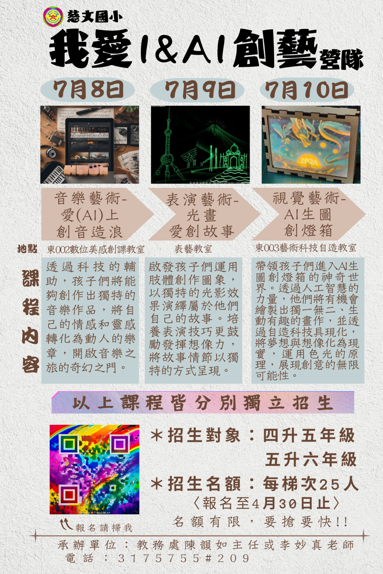 7月暑期 我愛 I & AI 創藝營隊 分別有三個不同場次,皆為獨立招生報名 *招生對象為:四升五年級、五升六年級 *招生名額:每場次 25 名 報名只到 4月30日 止。 <<名額有限,要搶要快!!>>