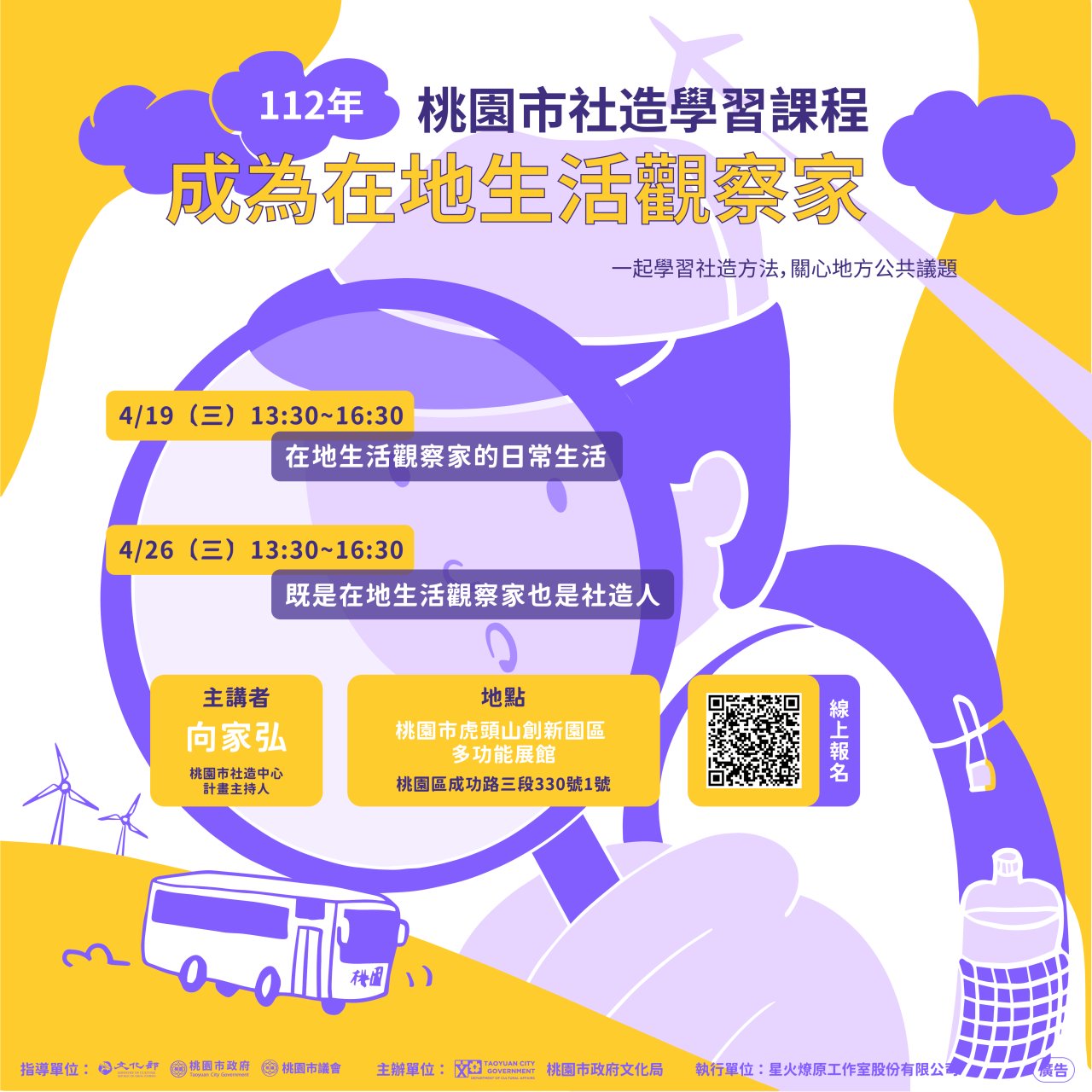 一、旨揭課程旨在傳揚社造觀念與方法,培育民眾透過學習社造,關心地方生活議題,以深化民主治理價值,實踐桃園永續發展。訂於112年4月19日(星期三)及4月26日(星期三)下午1時30分至4時30分,於虎頭山創新園區多功能展館舉辦2場次。