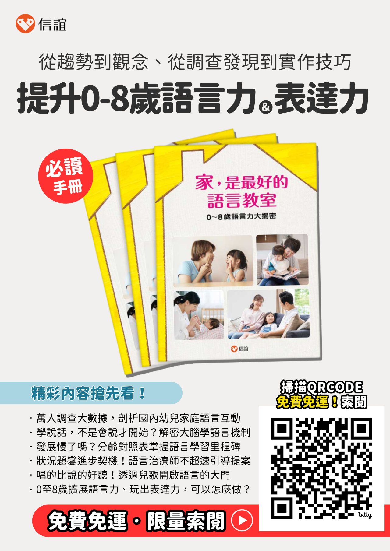 一、 信誼基金會為關心幼兒語言發展,透過網路收集10,403位家長的觀察數據,並邀請各領域寓言專家回應研究成果,並編纂《家,是最好的語言教室》語言特刊,深入探討語言的重要性、常見語言問題及其解決方案,如何透過共讀和遊戲促進對話。協助家長和照顧者建造一個優質的對話環境,讓家成為孩子最好的語言教室!