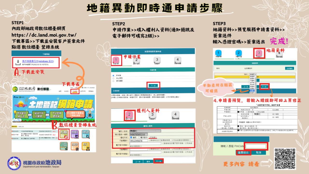 (2)參加方式 :凡不動產位於桃園市之所有權人於活動期間成功透過內政部數位櫃臺,以自然人憑證申辦桃園市轄內不動產之地籍異動即時通服務, 並正確回答問卷並詳實填載個人資料即可參加抽獎活動,更多詳情請至地政局官網。