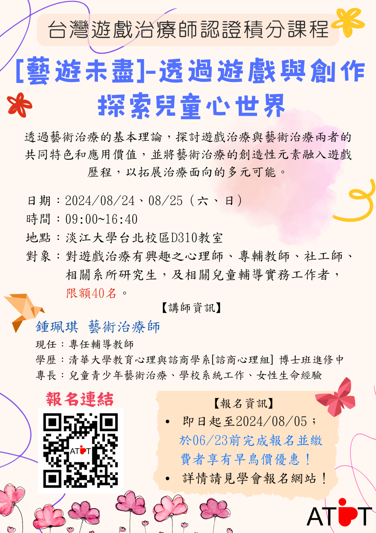 | 一、 | 2024台灣遊戲治療師認證積分課程【2024台灣遊戲治療師認證積分課程】:「藝遊未盡-透過遊戲與創作探索兒童心世界」課程時間及講師資訊。 |