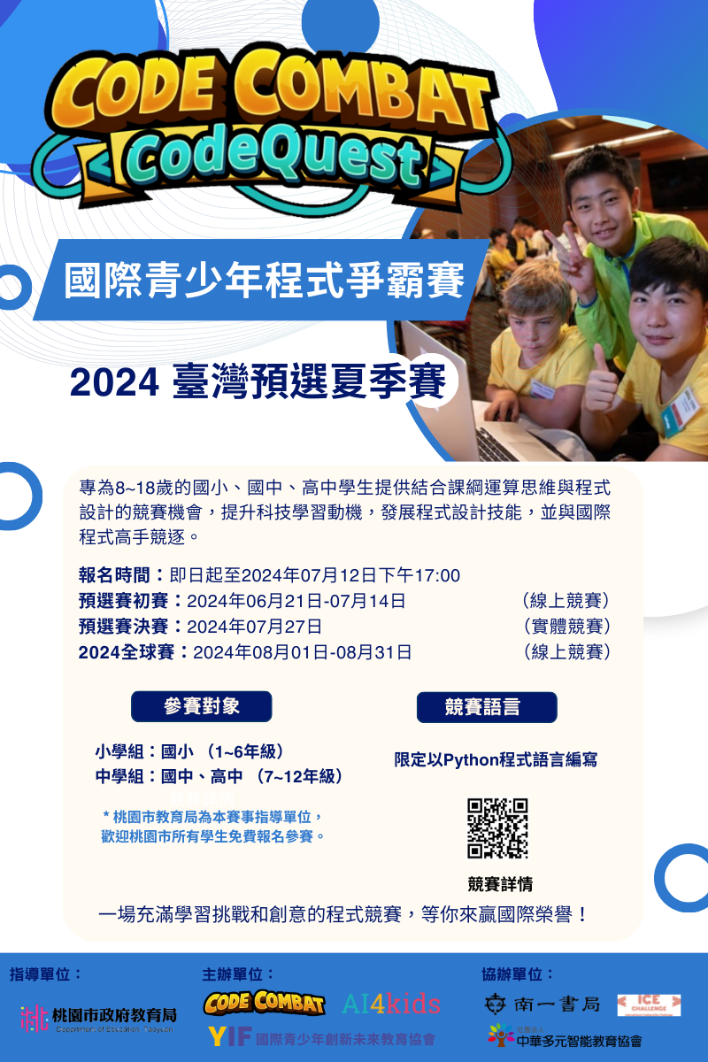 | 一、 | 2024年暑假,社團法人國際青少年創新未來教育協會攜手AI4kids、南一出版社、中華多元智能教育協會,為8~18歲的國小、國中、高中學生提供結合108課綱資訊素養的運算思維暨程式設計競賽機會,提升科技學習動機,發展程式設計技能,並與國際程式高手競逐。 |