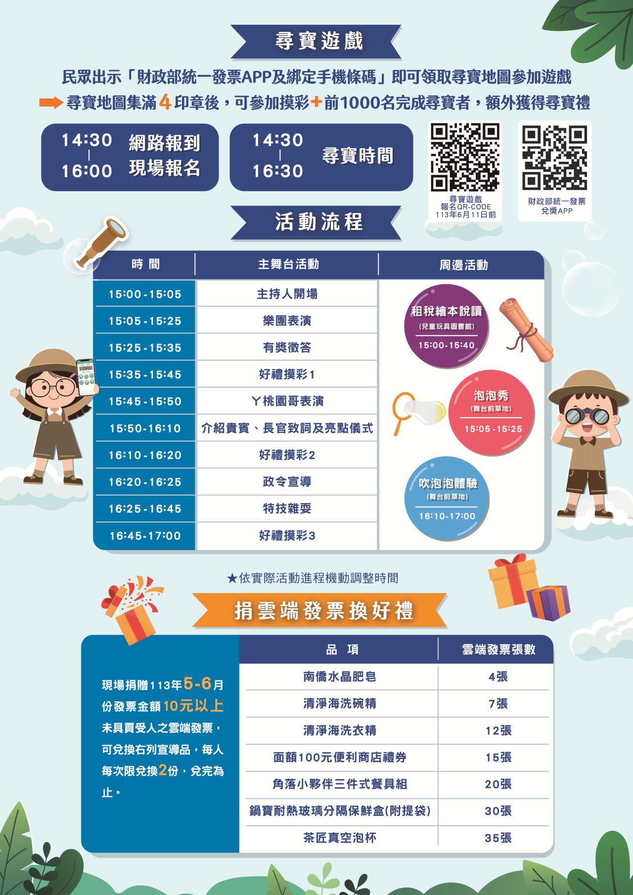 (三)活動內容:以親子一同益智尋寶為主軸,結合舞台表 演、摸彩及周邊攤位宣導方式辦理租稅宣導。
