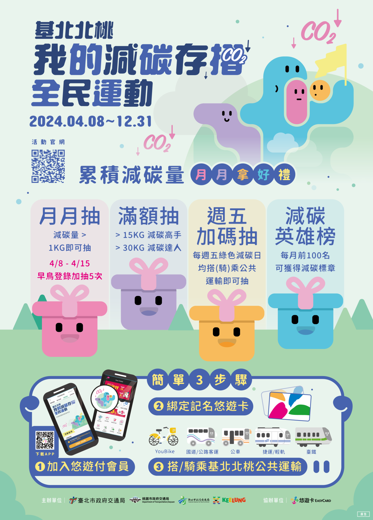 三、 旨揭宣導訊息:「基北北桃-我的減碳存摺全民運動」累計減碳量月月拿好禮及加入悠遊付會員,綁定悠遊卡並搭乘基北北桃大眾運輸即可參加抽獎【活動官方網站:https://co2-passbook.com/】。