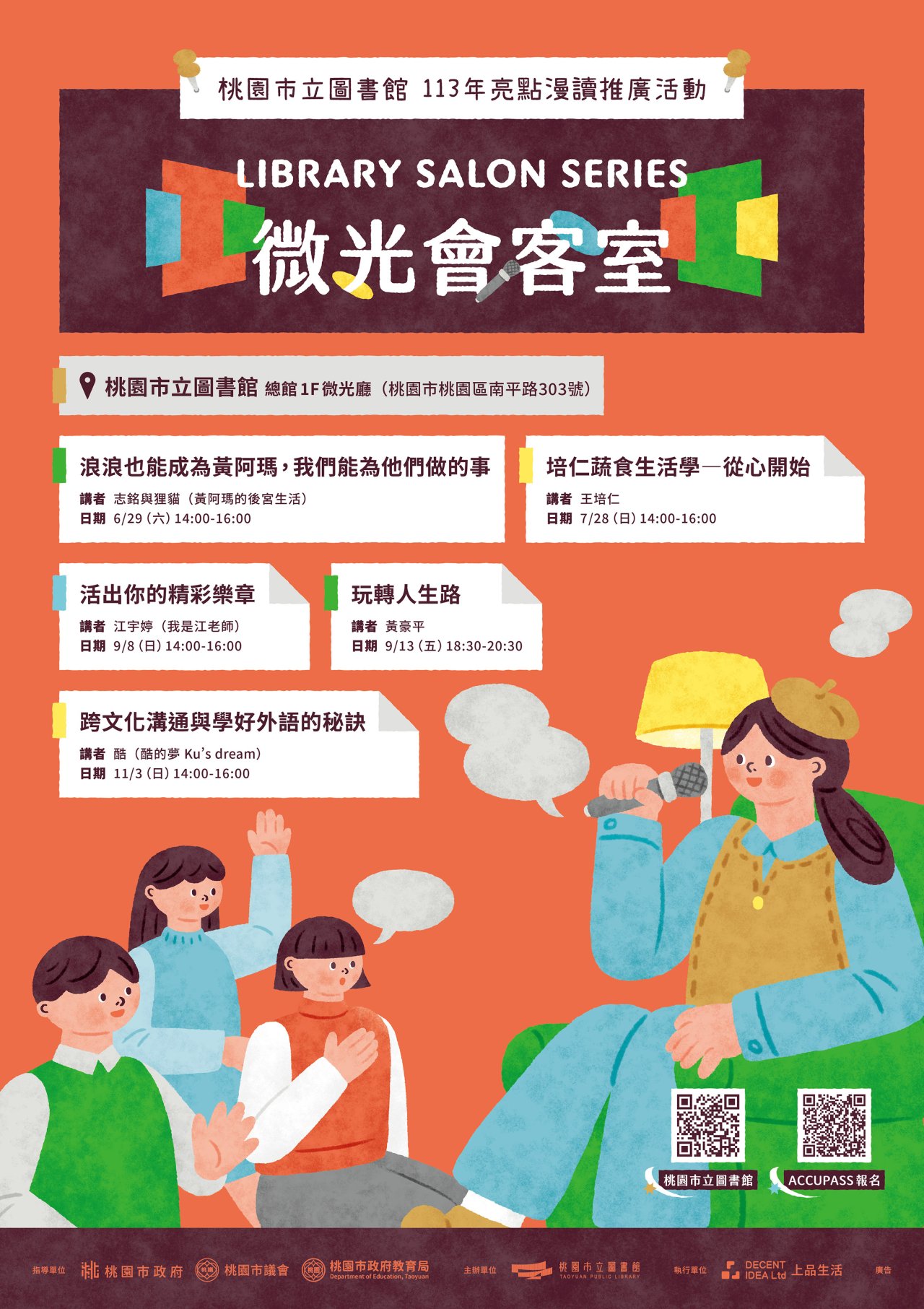 一、為活絡桃園閱讀城市形象,透過創意亮點行銷閱讀推廣,建立全齡化閱讀風氣,本館於今(113)年6月至11月間辦理一系列講座,邀請市民朋友一起走進閱讀時光,開拓生活視野建立多元價值。