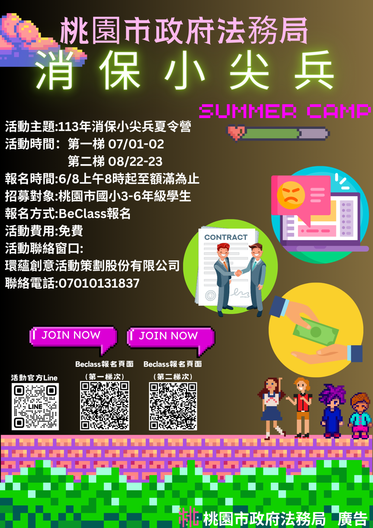壹、主旨:法務局辦理113年「消保小尖兵夏令營」活動一 案,鼓勵校內3至6年級學生,踴躍報名參加。