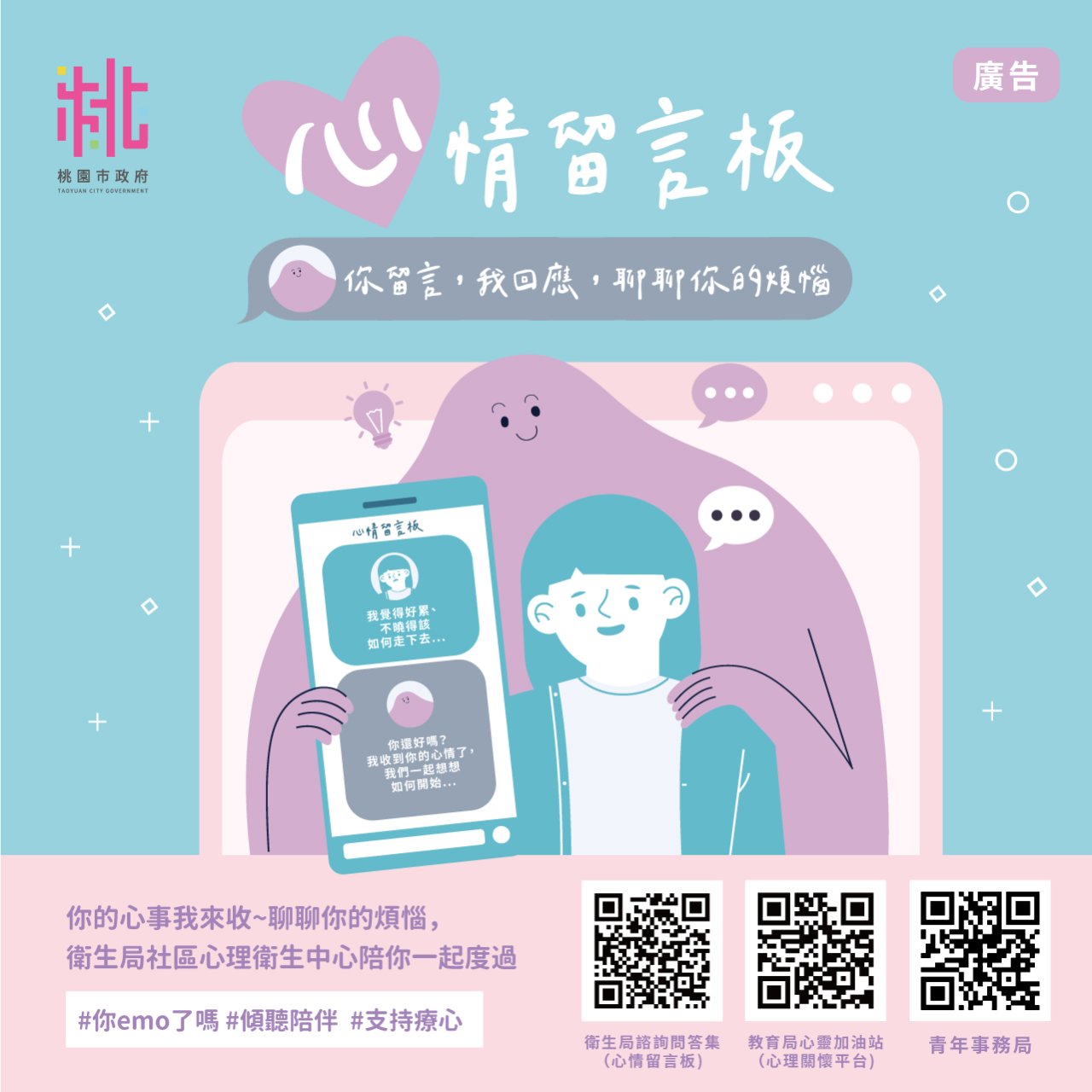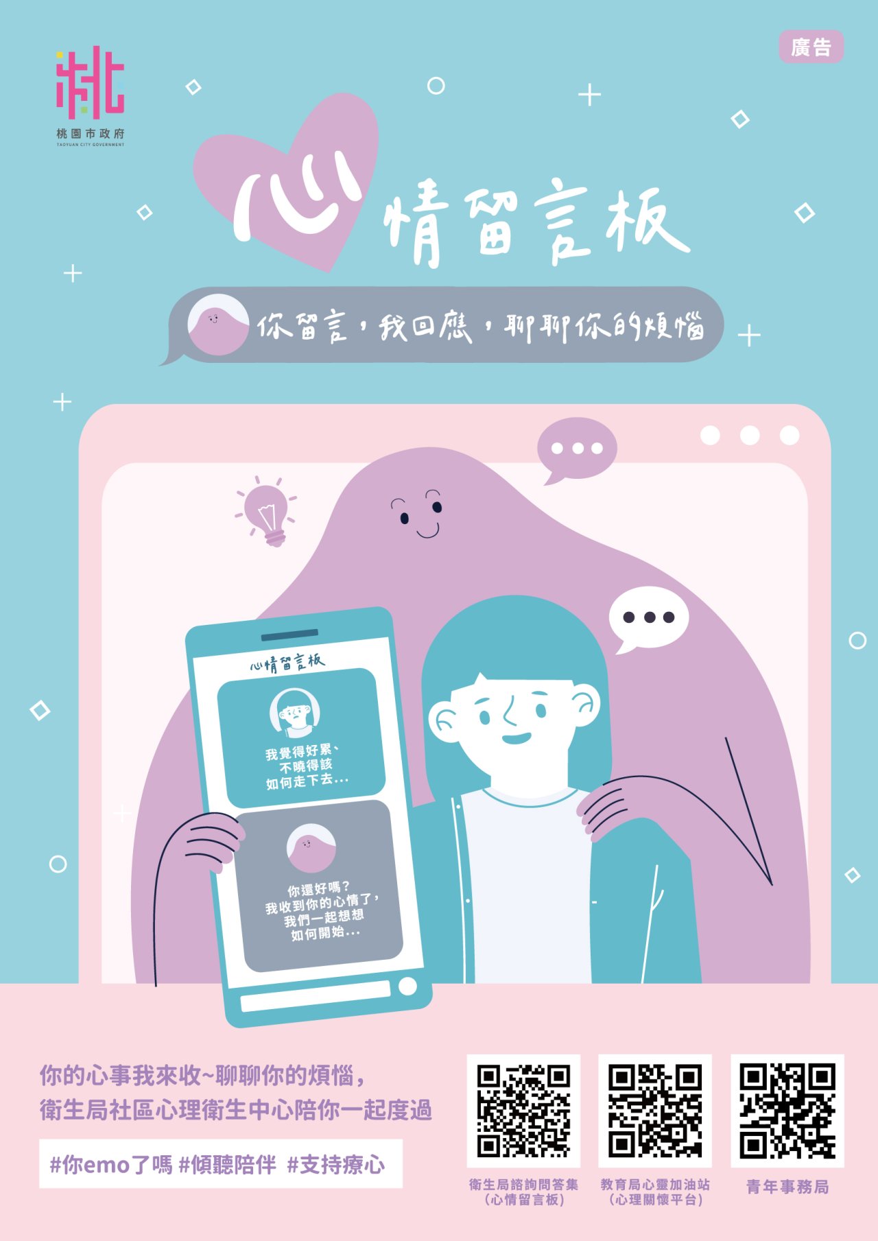 | 三、 | 檢附旨揭海報電子檔(附件1至2),該檔案亦可至本府衛生局社區心理衛生中心網站 (https://mental.tycg.gov.tw /)/諮詢問答集(心情留言板)/海報下載,請轉知所屬推廣運用。 |