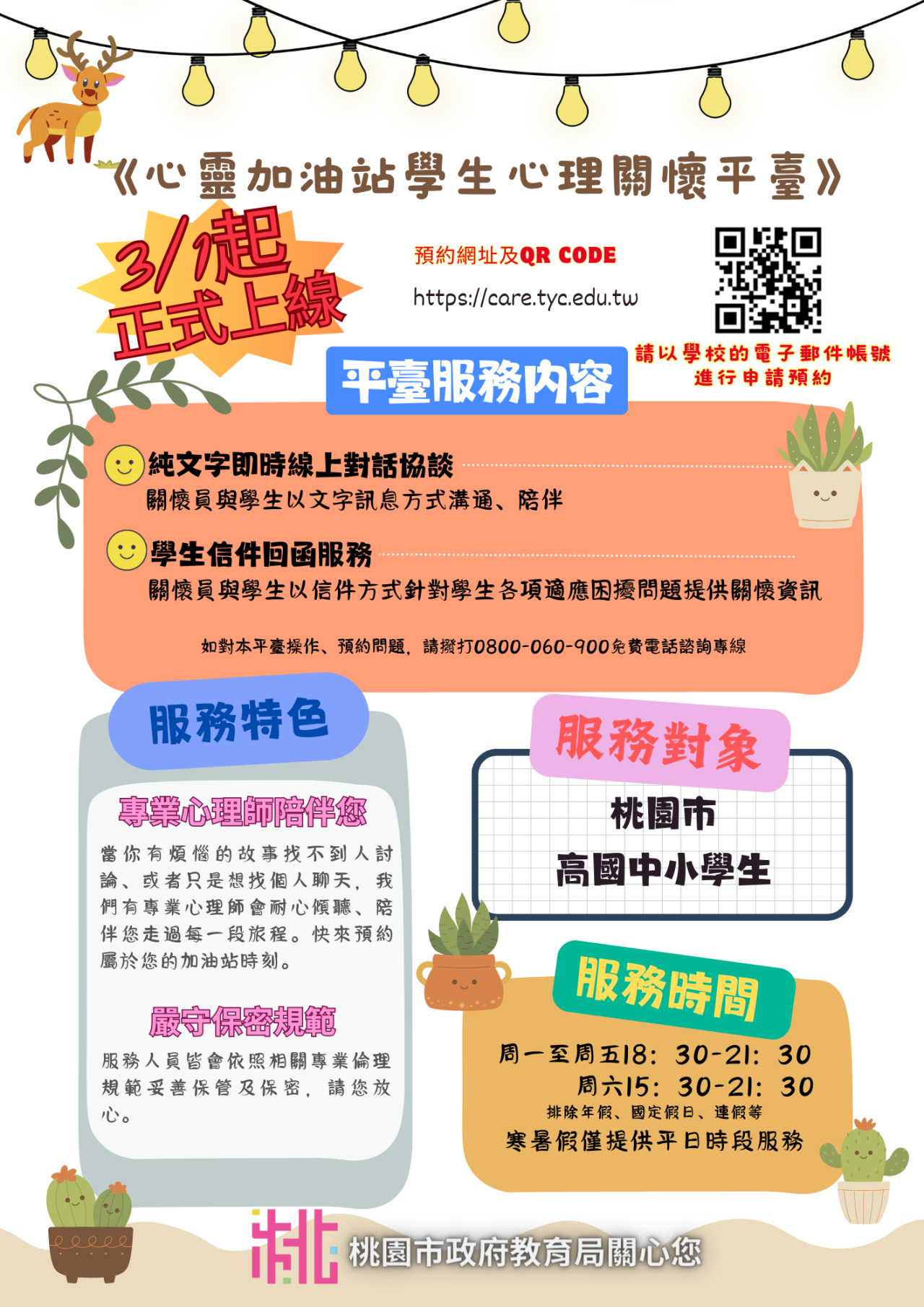 二、 為提供學生於放學後時段,如有人際相處、課業、生涯規劃 等遭遇問題待關懷諮詢,倘學生有心理健康議題,本局建置 「心靈加油站學生心理關懷平臺(網址:https:// care.tyc.edu.t w)」供使用。