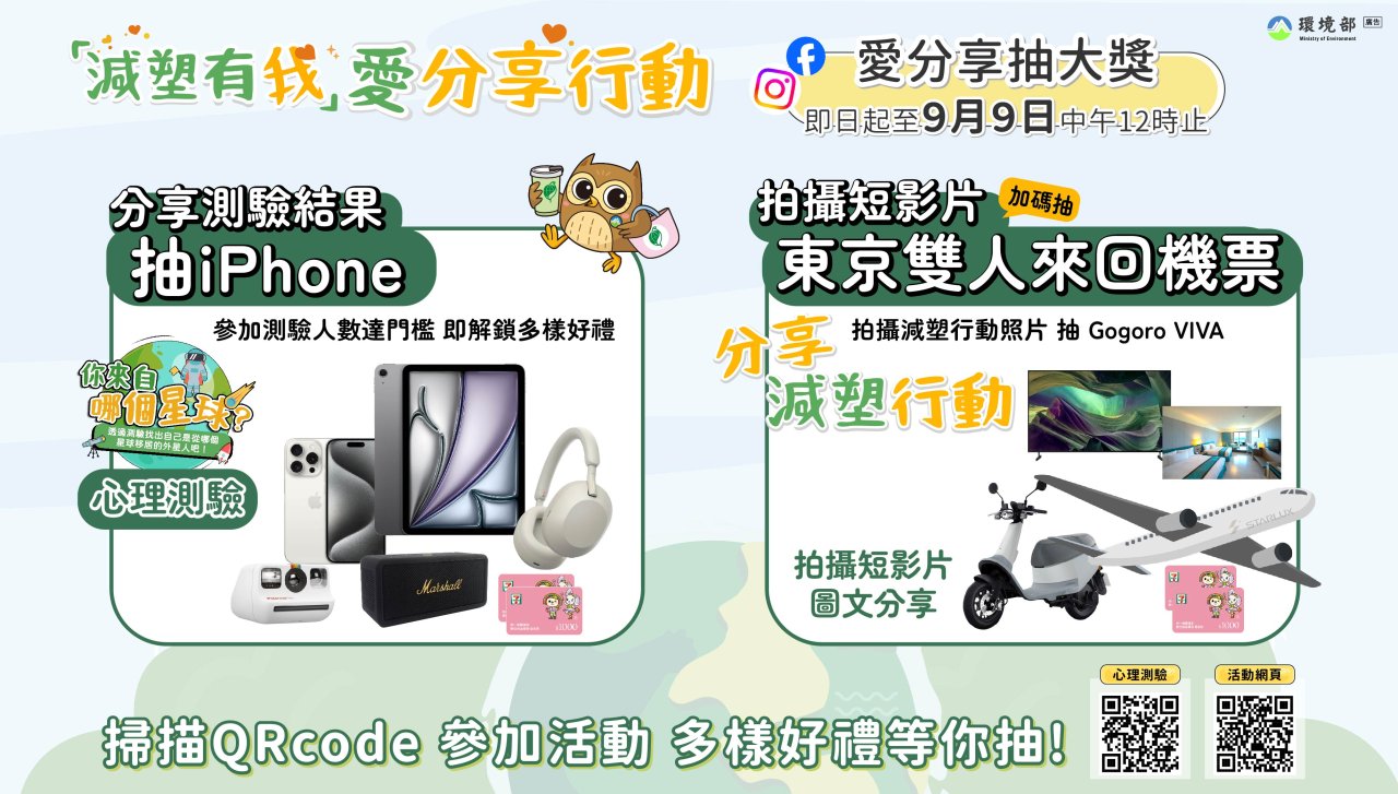 | 二、 | 環境部為鼓勵社會大眾及莘莘學子在暑期假期間一起跟上全球減少塑膠的風潮,特辦理「減塑有我」愛分享行動,可透過臉書(Facebook)、Instagram(IG)等社群媒體,拍攝個人生活中減塑短影片、減塑生活照片,並可透過參加 「你來自哪個星球?」心理測驗遊戲,瞭解並發覺屬於自己獨特的環保行動,歡迎民眾邀請親朋好友一起在生活中響應減塑行動,參加旨揭活動拿大獎。 |