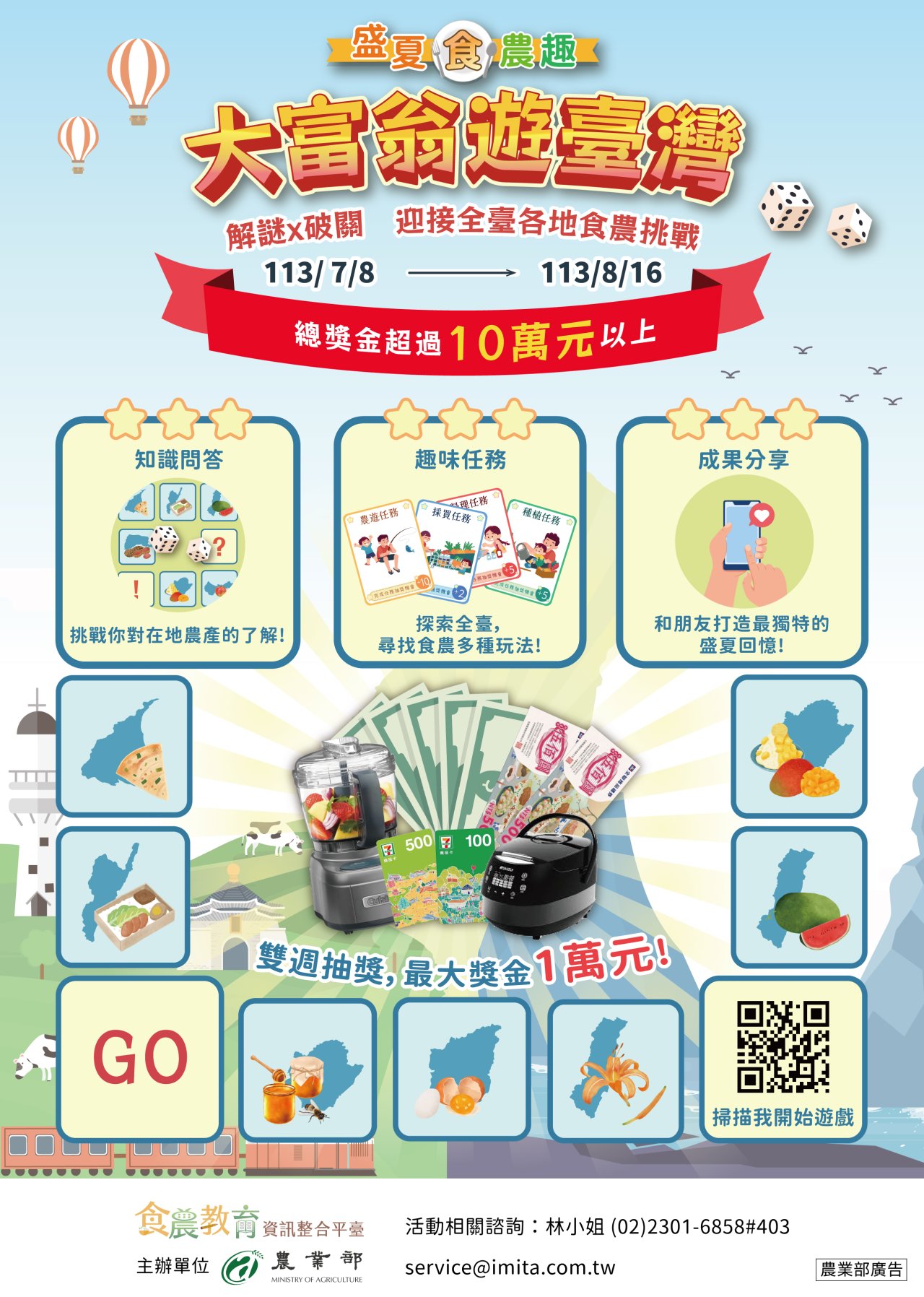 三、 為強化食農教育素養,並促使大眾更加瞭解食農教育,農業部應用前開平臺內容,辦理旨揭食農教育推廣活動(網址:https://fae.moa.gov.tw/2024event/),提供食農教育相關知識問答、任務體驗與成果分享等遊戲,參與活動即可抽獎,總獎金超過10萬元,歡迎踴躍參與。