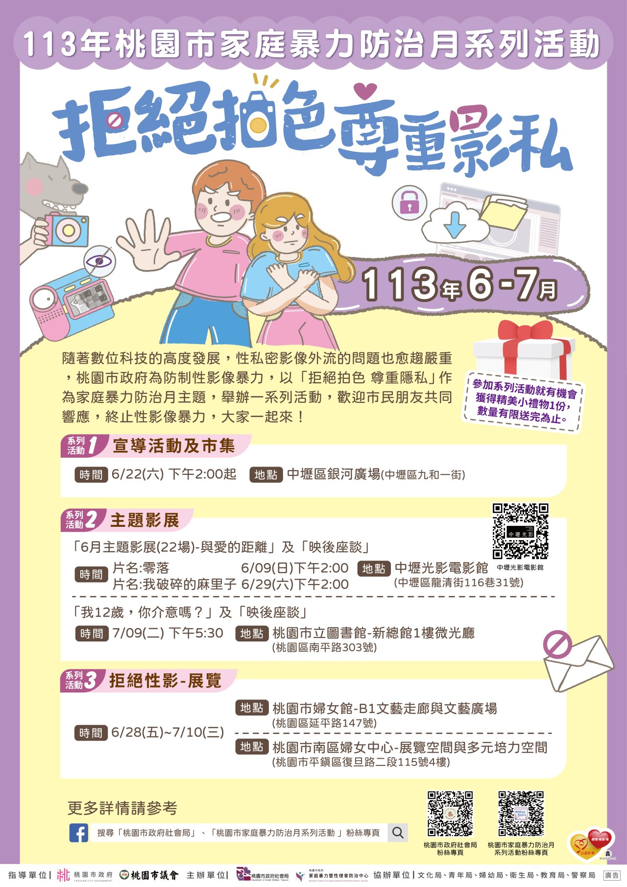| 二、 | 為因應性暴力犯罪防制四法及家庭暴力防治法自112年起修法,及呼應近期時事議題,提升社會大眾對性影像暴力防治關注,該中心於今年度家庭暴力防治月系列活動,特辦理電影播映及映後座談會,又因性影像暴力議題多發生於兒少及青年族群,爰鼓勵貴校教職人員參與,增加對性影像暴力防治認識。 |
