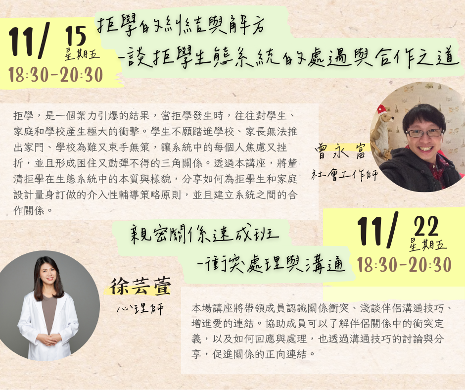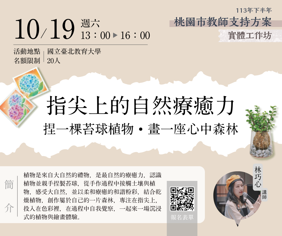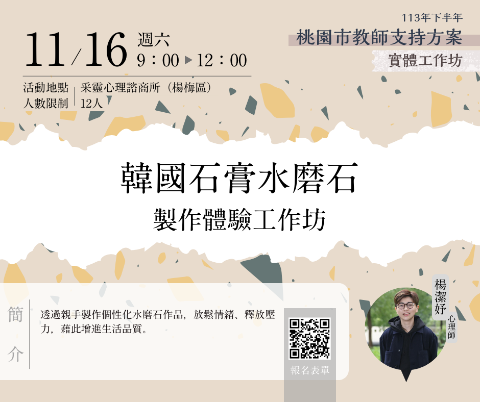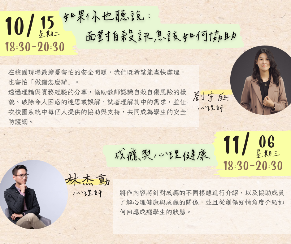 | 一、 | 為增進本市教師全人成長及自我覺察,且有機會紓解工作壓 力以達身心健康之效,國立臺北教育大學(心理諮商暨健康 促進研究中心)自113年9月22日至11月28日止,規劃辦理4場 次實體工作坊及5場次教師線上研習課程。倘有需求之教師,可逕至本局教師諮商輔導支持服務網站「最新消息」(https://ttsc.whjhs.tyc.edu.tw/news/)參閱課程資訊,並依課程說明至相應網址完成報名程序。 |