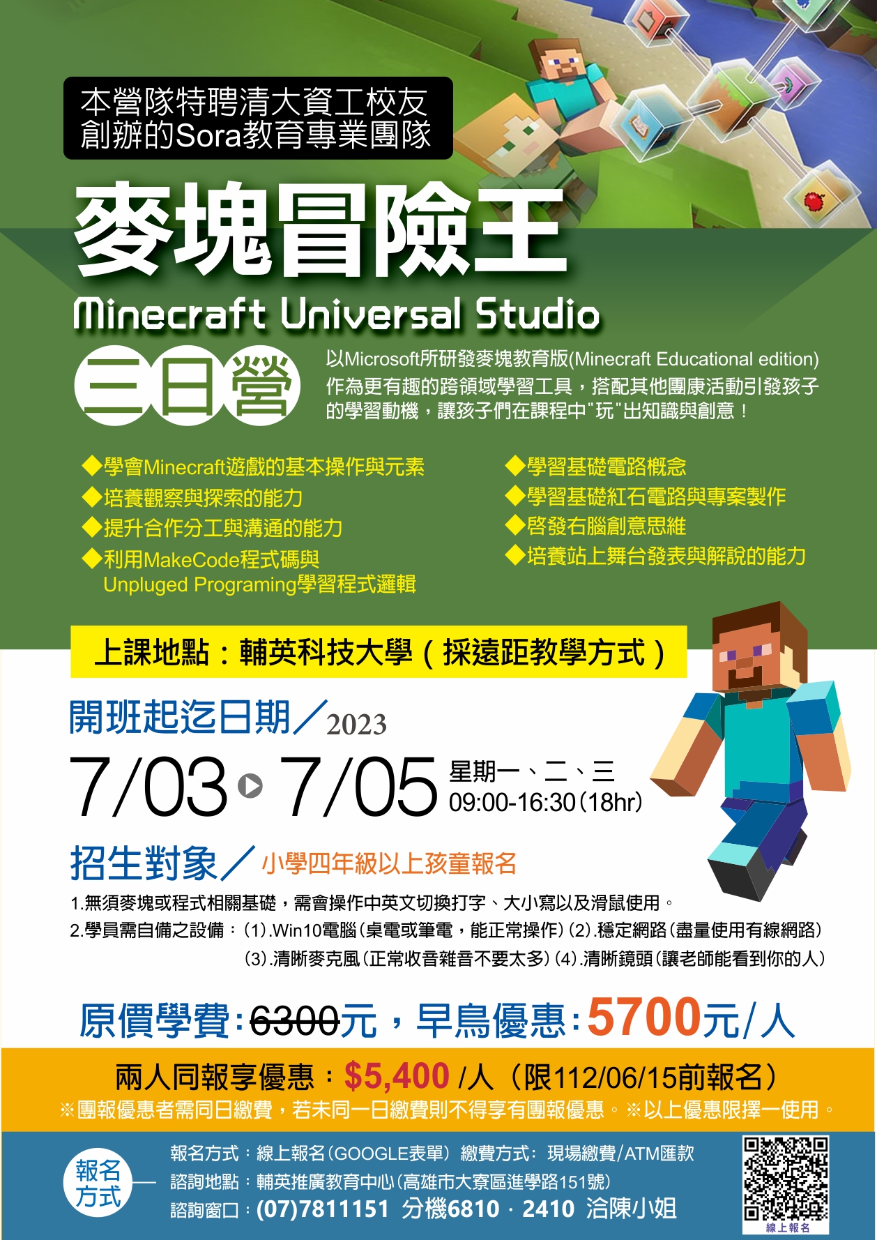 | 一、 | 課程特色:以Microsoft所研發麥塊教育版(Minecraft Educational edition)作為更有趣的跨領域學習工具,搭配其他團康活動引發孩子的學習動機,讓孩子們在課程中『玩』出知識與創意 |