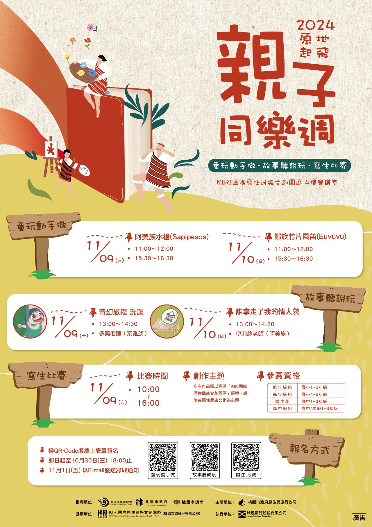 | (一) | 活動緣起:本次活動旨在透過富有互動性和趣味性的多元親子活動,帶領民眾認識原住民族文化,其中「童玩動手做」將由講師引導參與者製作原住民傳統童玩,展現原住民族對自然資源的巧妙運用和深厚的工藝技術;「故事聽說玩」將由講師精心挑選的繪本,帶領參與者以聽、說、玩的形式探索原住民族的歷史、習俗及生活方式;「寫生比賽」鼓勵參與者覺察「KIRI國際原住民族文創園區」景觀環境,再透過畫筆表達對周遭環境及原住民族文化的理解與感受。期盼一系列的親子活動促使參與者透過親身體驗增進對原住民族多元文化的理解與尊重,並促進社會文化交流與共榮。 |