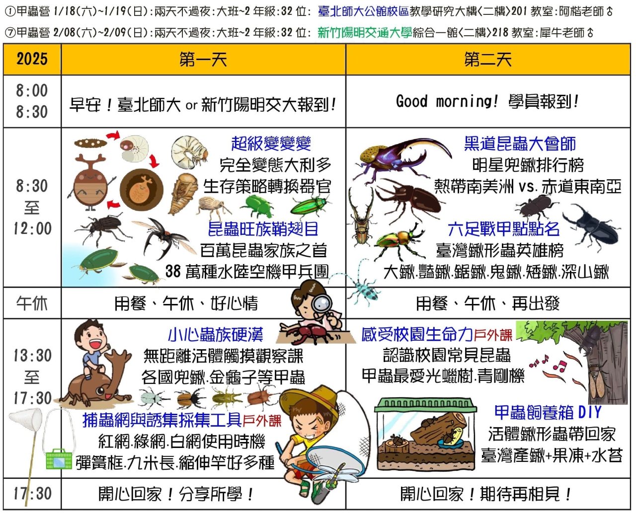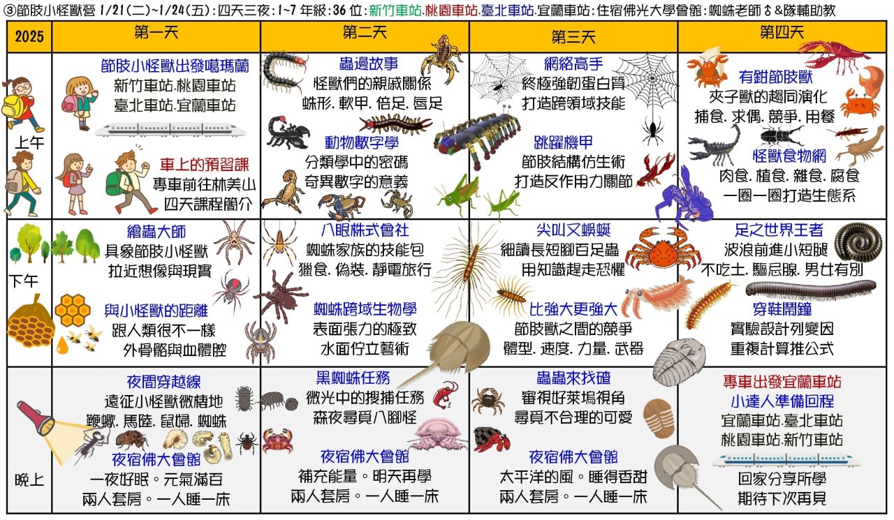 說明: 愛上大自然文教將於114年寒假辦理【大樹聚 島航去】2025生態素養冬令營共七個梯次,暨參展2025第六屆臺灣國際昆蟲博覽會活動。