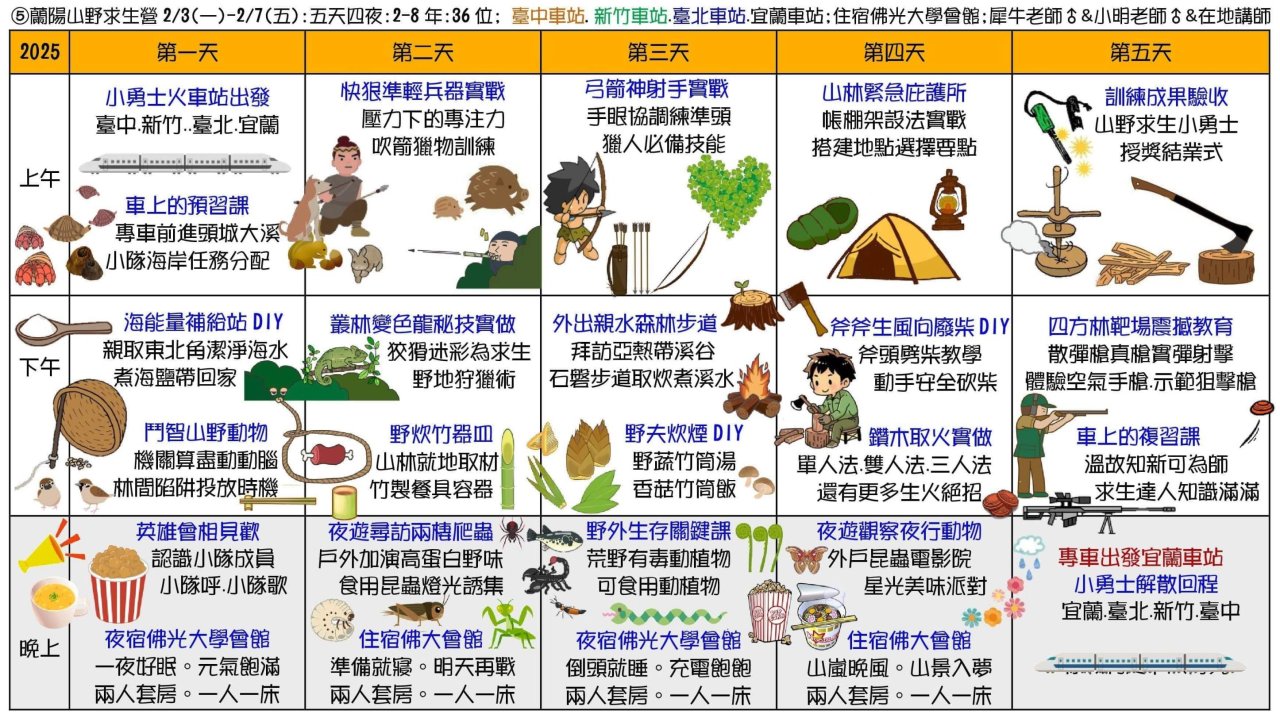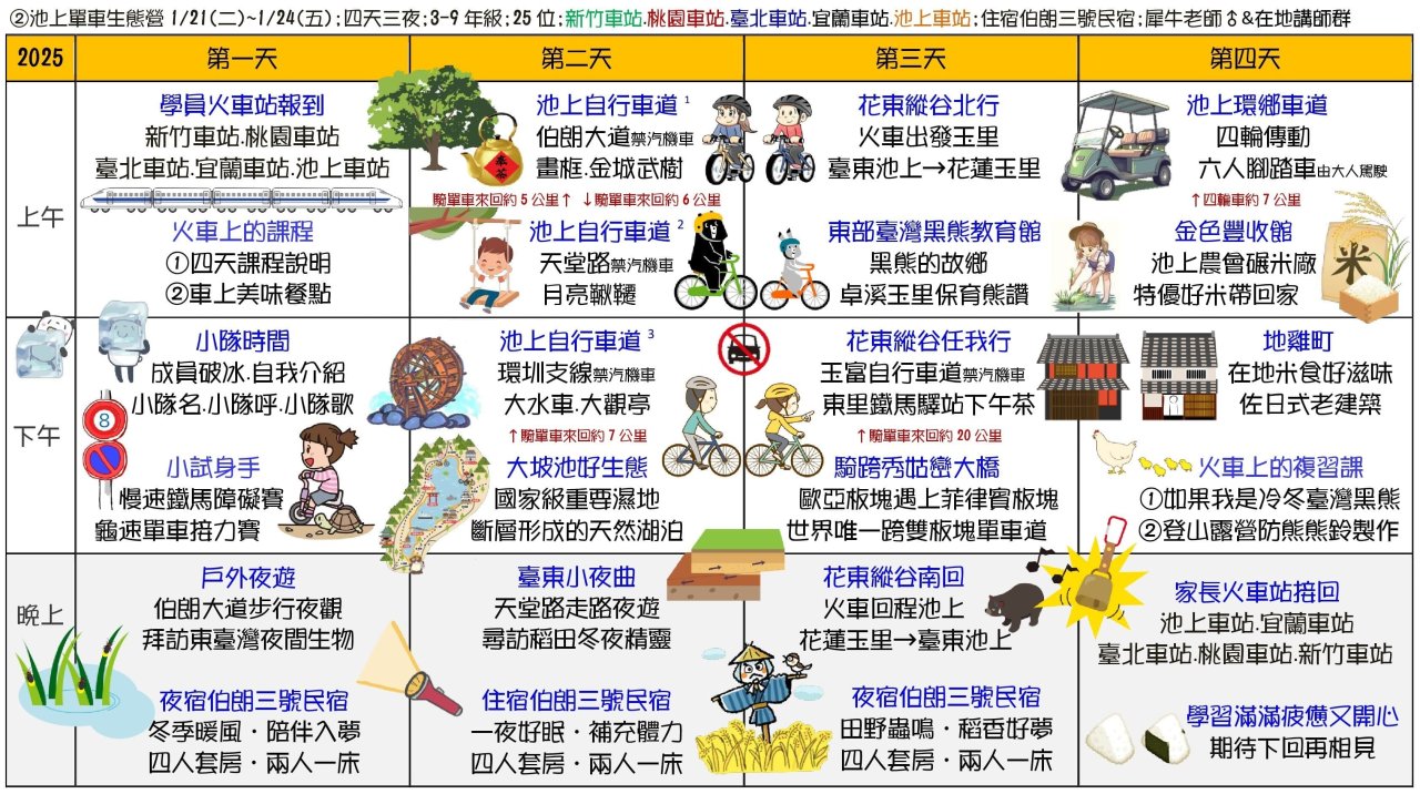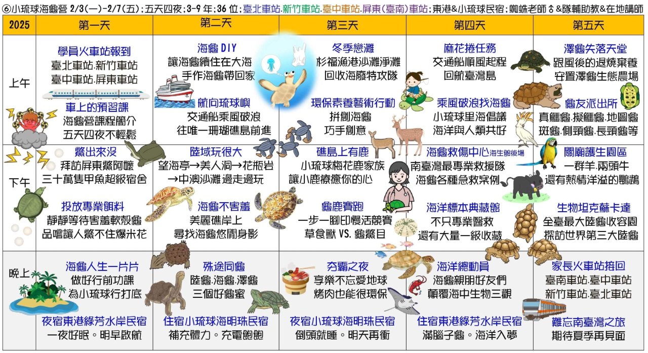 二、 冬令營課程主題為:①甲蟲營(2天)、②池上單車生態營(4天3夜)、③節肢小怪獸營(4天3夜)、④宜蘭生態農場營(3天2夜)、⑤蘭陽山野求生營(5天4夜)、⑥小琉球海龜營(5天4夜)。