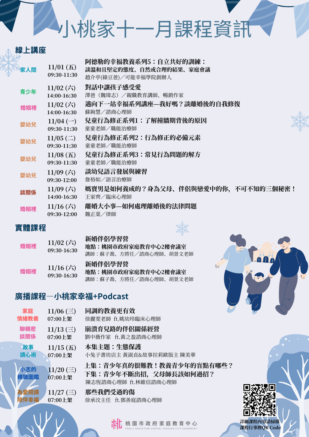 或追蹤「桃園市政府家庭教育中心」FB粉絲專頁;另倘有家庭教育個別化服務需求,可撥打4128185諮詢專線或申請小桃家線上諮詢室(https://reurl.cc/oZWOY5 )服務。