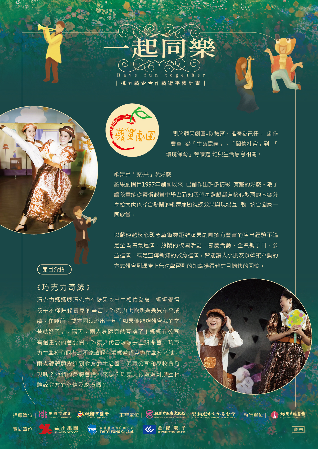 本活動定於114年4月13日(星期日)下午3時,邀請「蘋果劇團」於新屋區頭洲兒七公園(桃園市新屋區福洲二街)辦理演出。