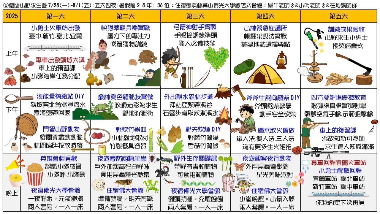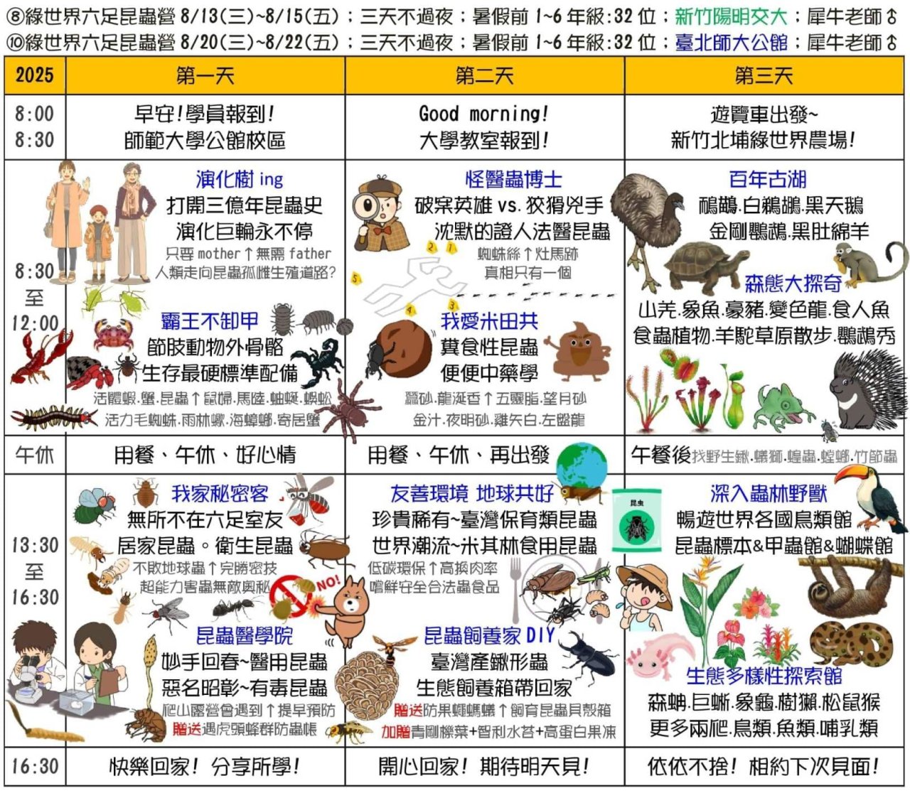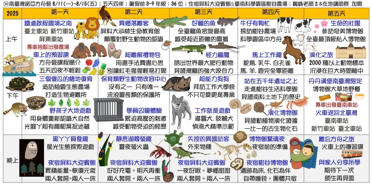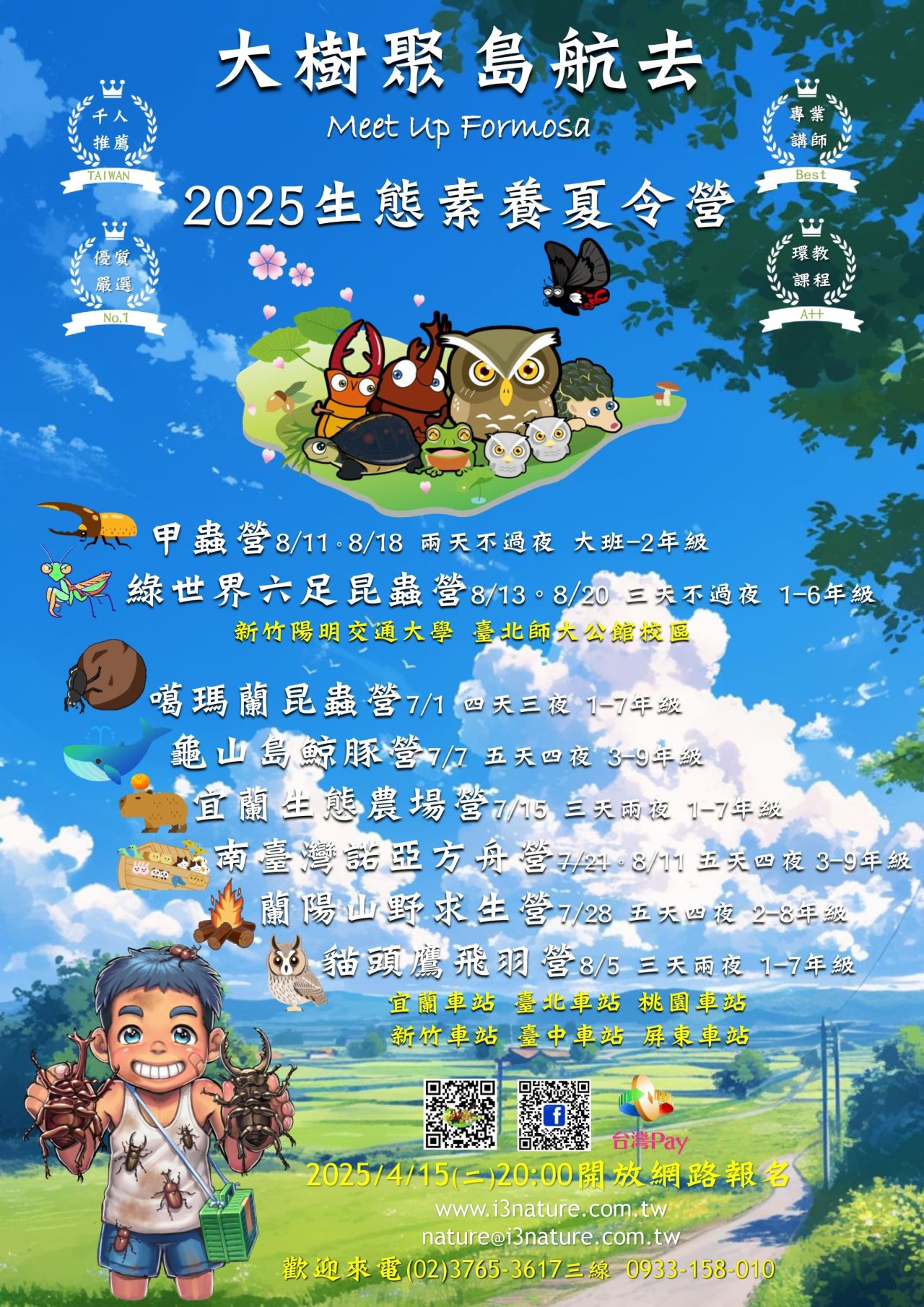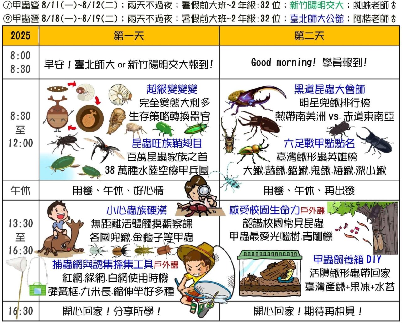 一、 2025生態素養夏令營日期7/2~8/26,招生涵蓋大班-九年級學員,請依不同課程分齡參加,詳細請見營隊網站https://www.i3nature.com.tw/。