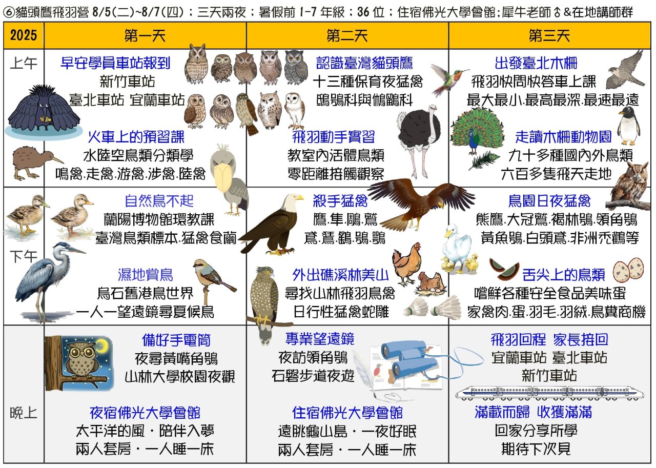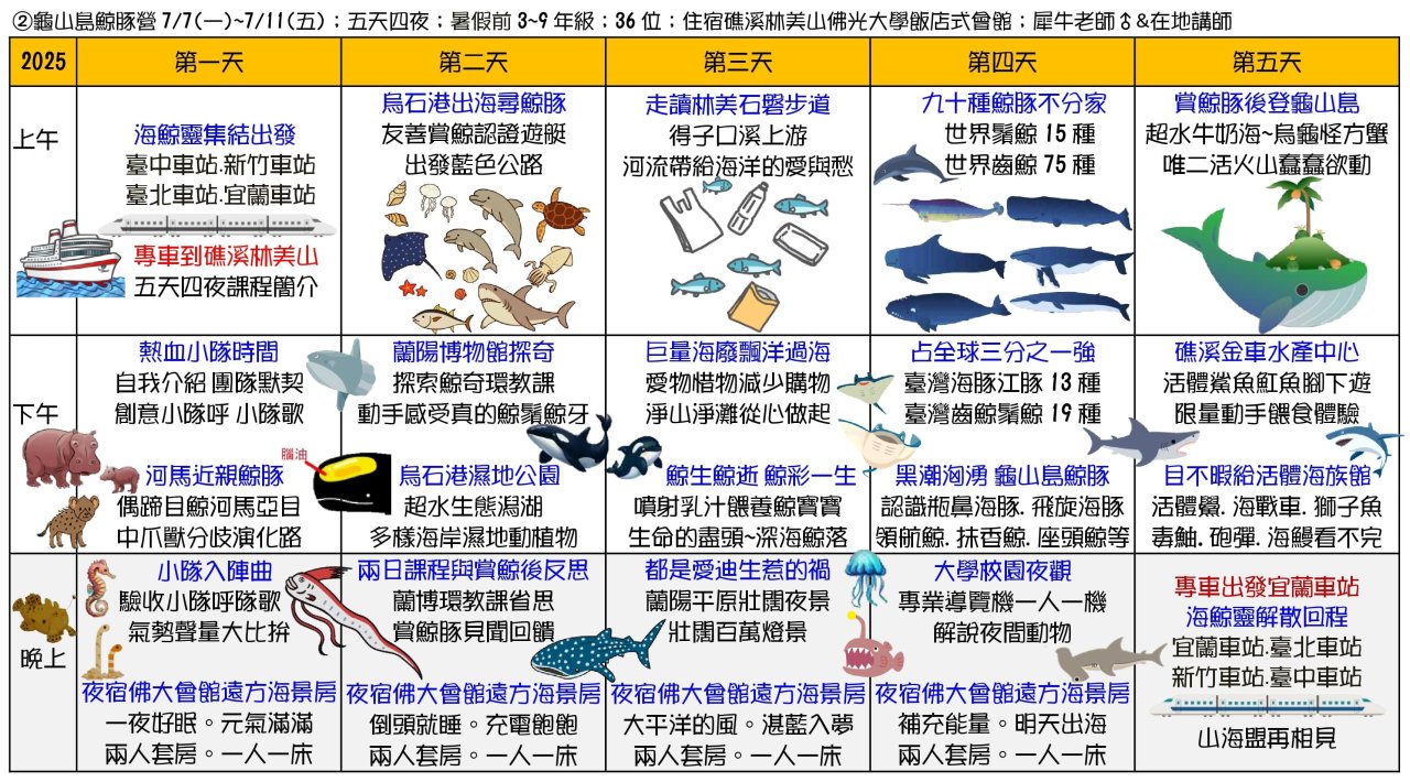 二、 課程主題包括:①噶瑪蘭昆蟲營②龜山島鯨豚營③宜蘭生態農場營④南臺灣諾亞方舟營⑤蘭陽山野求生營⑥貓頭鷹飛羽營⑦甲蟲營⑧綠世界六足昆蟲營⑨滿月圓森林營⑩東北角漁村營⑪池上單車營共十三梯次過夜與非過夜營隊。