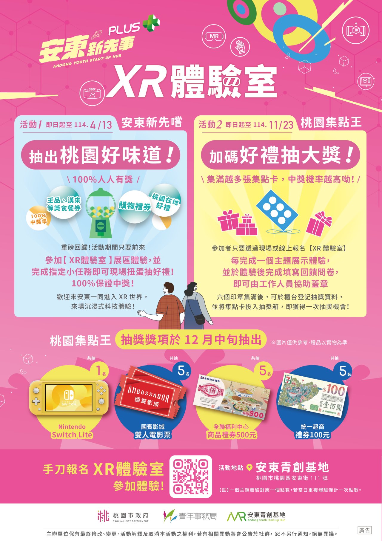 | 一、 | 本局所轄的安東青創基地,致力於推廣及發展延展實境(XR)、元宇宙、教育科技等相關領域。基地內設有XR體驗館,並配備先進設施,讓學生能親身體驗與學習。目前,基地正同時展出四種不同主題的體驗展,未來將不定期更新主題,並辦理不定期抽獎活動,敬邀貴校師生踴躍參與,期待體驗展能增加學生接觸XR 領域的技術及應用。 |