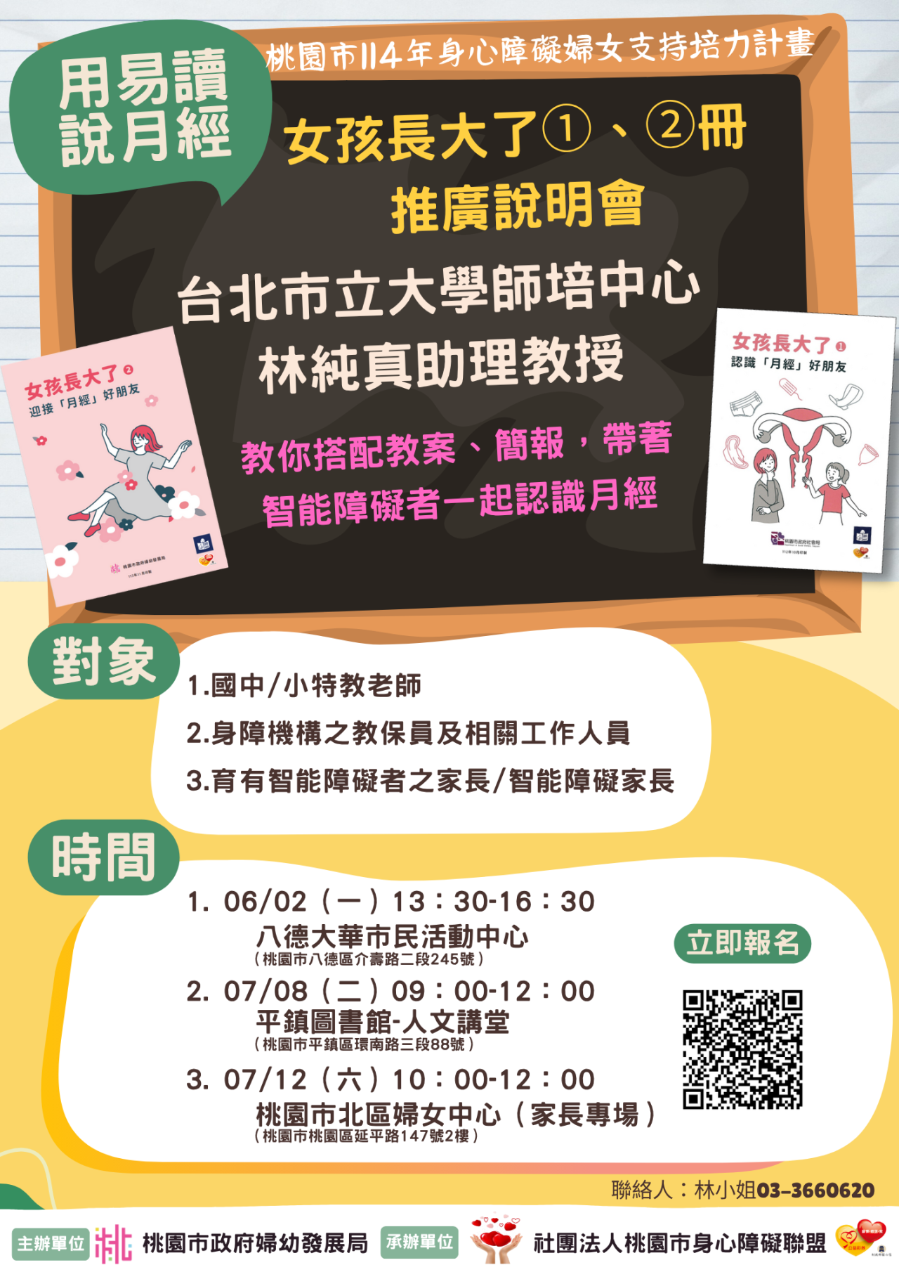 二、 為提升智能障礙女姓對月經之認識,特辦理推廣說明會3場次(如下),請鼓勵相關人員報名參訓,報名連結:https://forms.gle/mgRh527ZiuXPpgck6。
